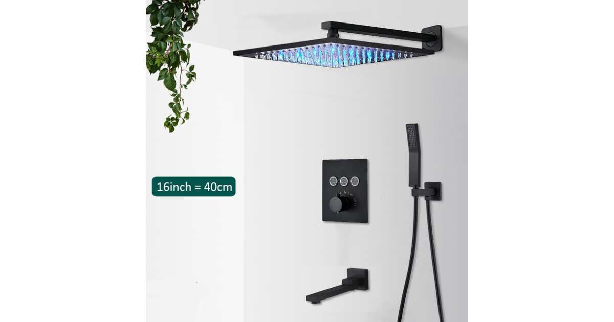 Genieße modernes Design und komfortables Duschen mit dieser stylischen, matt schwarzen Blackswan M154 Duschgarnitur! Die 40 cm große, LED-beleuchtete Kopfbrause, die Handbrause und die Wannenarmatur – eine perfekte Kombination für komfortables und vielseitiges Duschen.