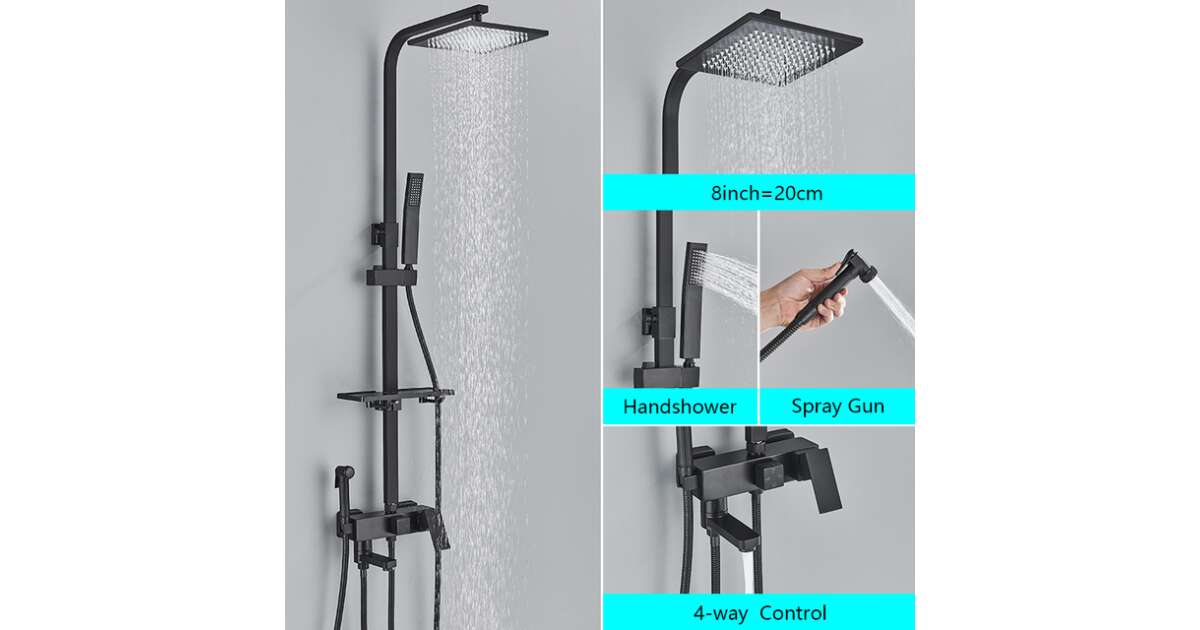 Duschsäule, Blackswan, Typ M128, verstellbares mattschwarzes Modell, mit beweglichem Wasserhahn, Hochdruckbrause und Ablage, Größe 20 cm Beschreibung