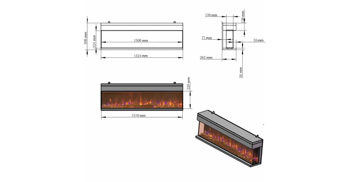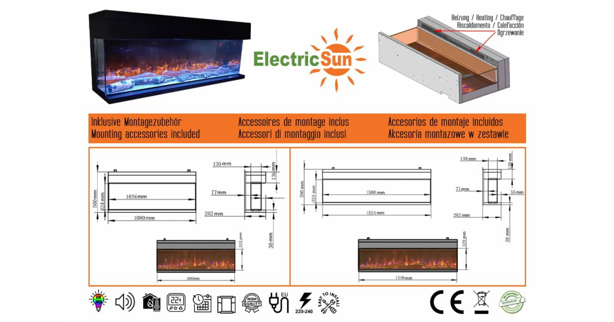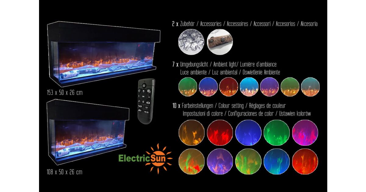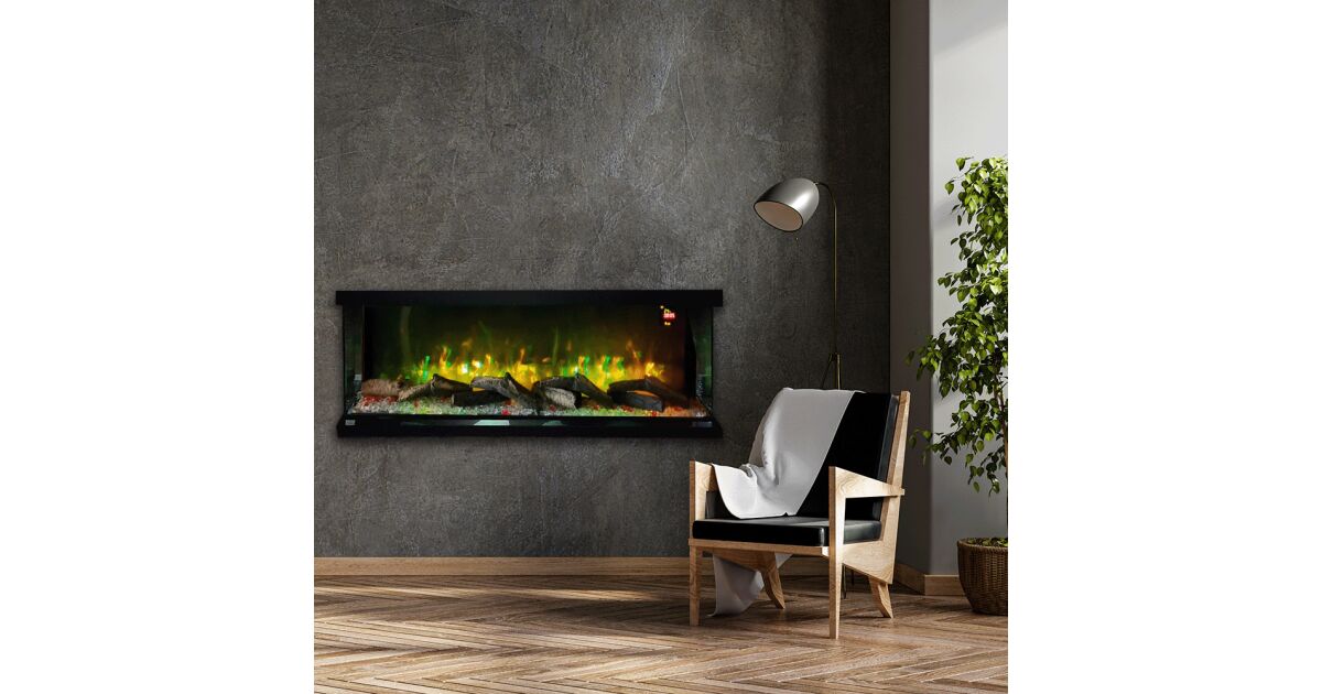 3-seitiger Elektrokamin ElectricSun VISTA medium, mit Soundeffekt, wandmontiert, freistehend oder eingebaut, 7 Farbeinstellungen, L153xH50cm Beschreibung