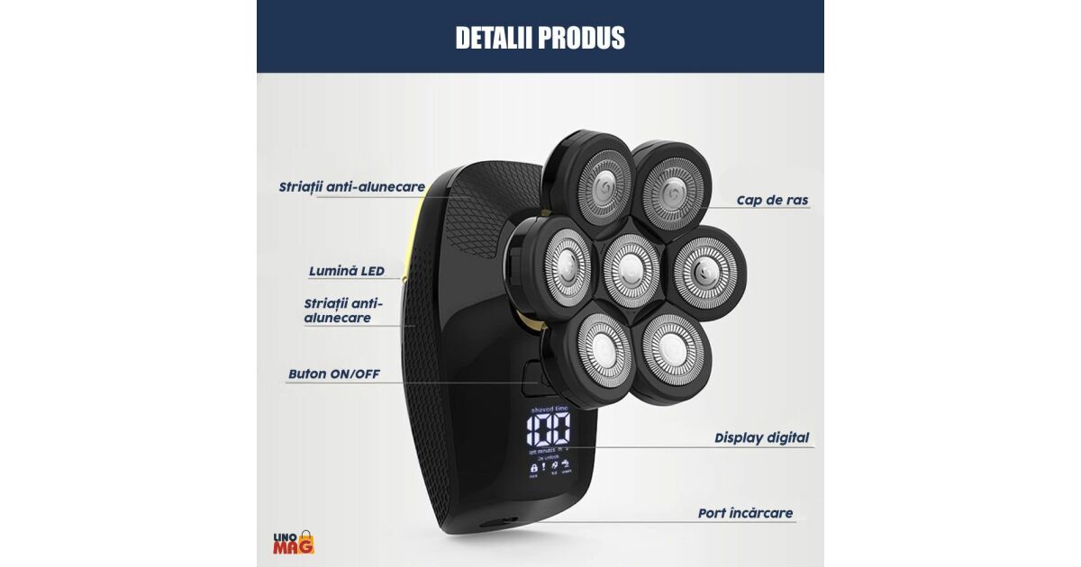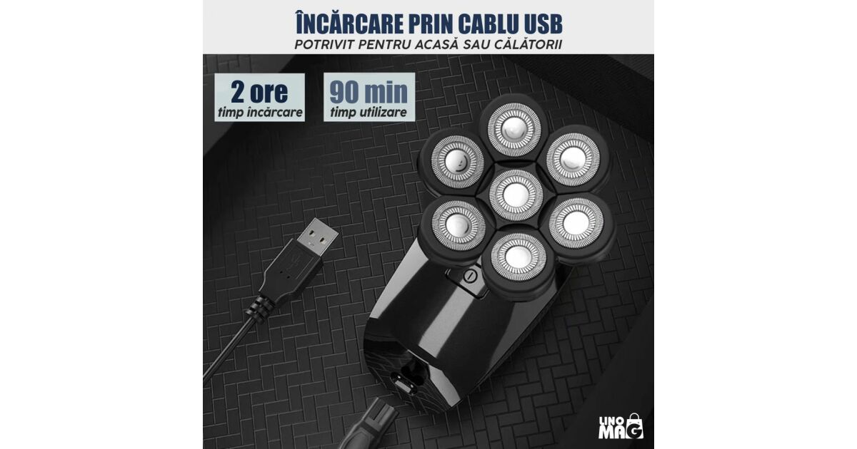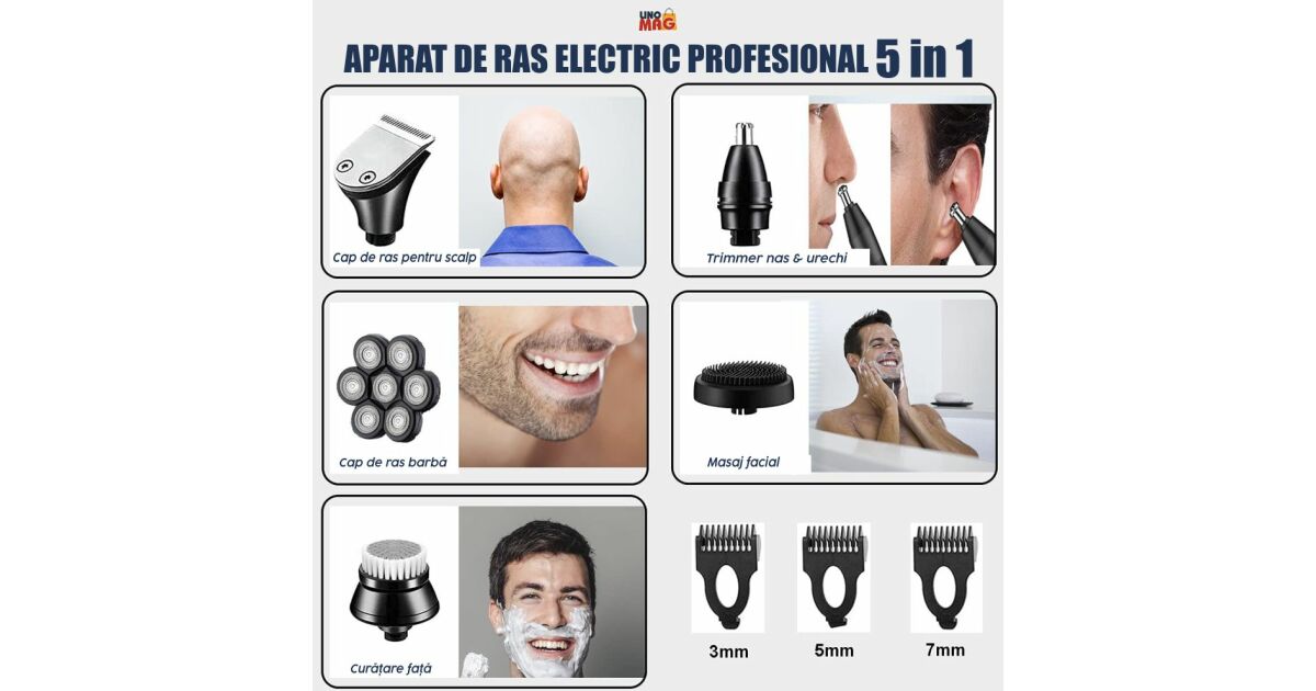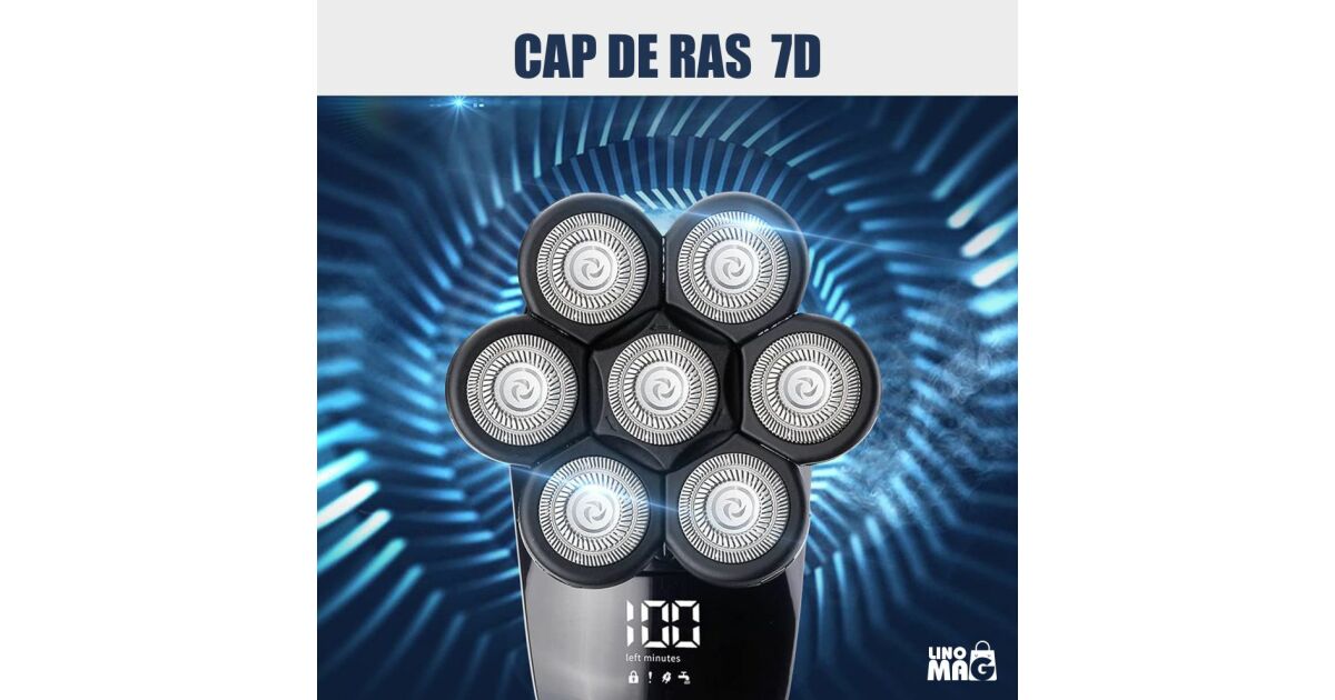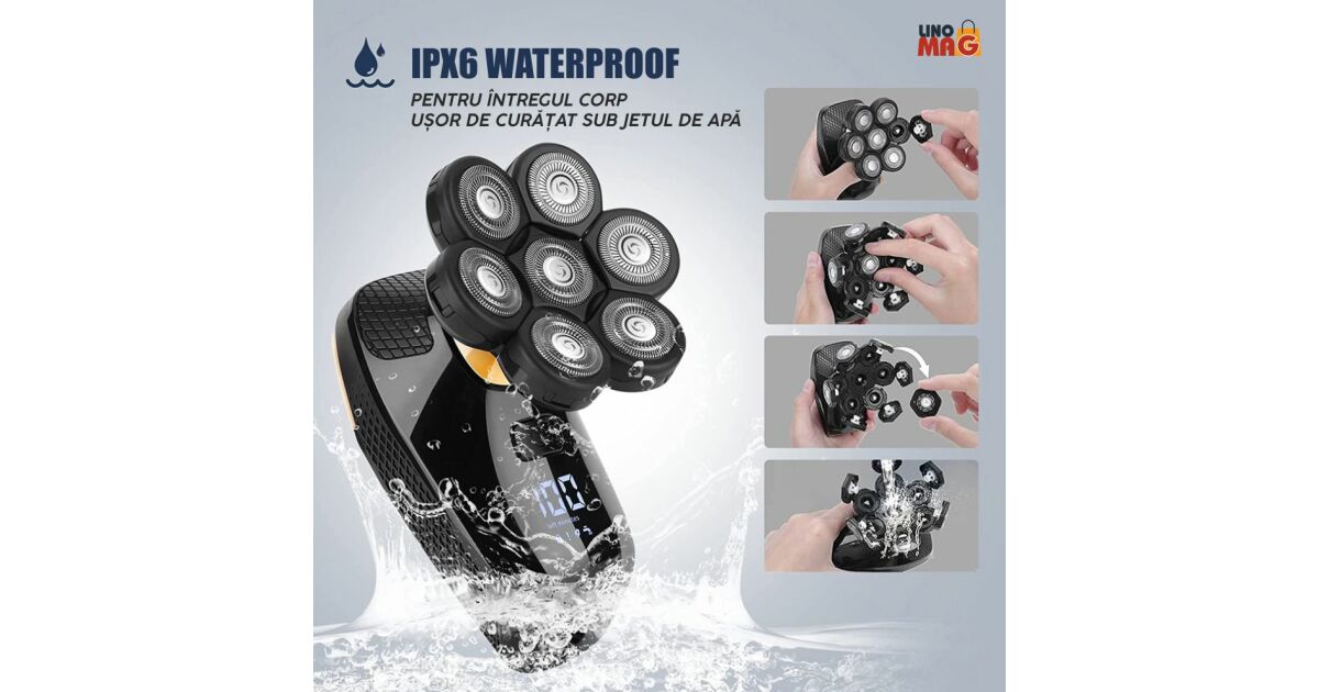 BESCHREIBUNG Entdecken Sie den 7D 5-in-1 Elektrorasierer, ein Multifunktionsgerät für die komplette Pflege von Bart, Haaren und Nase. Ausgestattet mit fortschrittlicher 7D-Technologie und flexiblen, rotierenden Rasierköpfen sorgt er für ein präzises, gleichmäßiges und komfortables Trimmen und Rasieren ohne Hautirritationen. Dank seiner Wasserdichtigkeit kann er auch unter der Dusche verwendet werden, und der USB-Akku bietet längere Akkulaufzeit für den Einsatz an jedem Ort. Die digitale LED-Anzeige zeigt Akkustand und Gerätestatus an, und das kompakte und ergonomische Design ermöglicht eine einfache Handhabung. Perfekt für Männer, die stets gepflegt und elegant aussehen möchten. MERKMALE 5 Funktionen in einem Gerät: Rasieren, Trimmen, Konturieren, Nasen- und Ohrenpflege, präzise Rasur. Fortschrittliche 7D-Technologie: Flexible Drehköpfe ermöglichen eine einfache Handhabung und optimale Anpassung an jede gekrümmte Oberfläche. IPX6-Wasserbeständigkeit: Verwenden Sie es sorgenfrei unter der Dusche oder reinigen Sie es einfach unter fließendem Wasser. Leistungsstarker, per USB aufladbarer Akku: verlängerte Akkulaufzeit durch Schnellladen, ideal für Reisen und den täglichen Gebrauch. Digitale LED-Anzeige: Zeigt den Batteriestand und den Gerätestatus an, sodass Sie jederzeit die volle Kontrolle haben. Ergonomisches und kompaktes Design: für angenehmen Griff und präzisen Einsatz auch an schwer erreichbaren Stellen. SPEZIFIKATIONEN Produkttyp: 5 in 1 professioneller Multifunktions-Elektrorasierer Funktionen: Kopf- und Gesichtsrasur, Trimmen, Konturieren, Nasen- und Ohrenhaartrimmer, Gesichtsreinigung Köpfe: 5 austauschbare Köpfe (7D-Scherkopf, Präzisionstrimmer, Nasen-/Ohrhaartrimmer, Gesichtsbürste, Konturaufsatz) Klingentechnologie: 7D rotierende Edelstahlklingen Bewegungswinkel: 360° – flexible Köpfe in 7 Richtungen Anzeige: Digital LED – Akkuprozentanzeige, Reinigungs- und Ladeanzeige Wasserbeständigkeit: IPX6 – vollständig abwaschbar, unter der Dusche verwendbar Akku: Wiederaufladbarer Lithium-Ionen-Akku Akkulaufzeit: bis zu 90 Minuten Dauerbetrieb Ladezeit: ca. 2 Stunden Stromversorgung: Aufladen über USB-Kabel (im Lieferumfang enthalten) Eingangsspannung: 5V / 1A Anwendung: Nass oder trocken Maße: Kompakt, ideal für den Transport Farbe: Mattschwarz mit goldenen Details