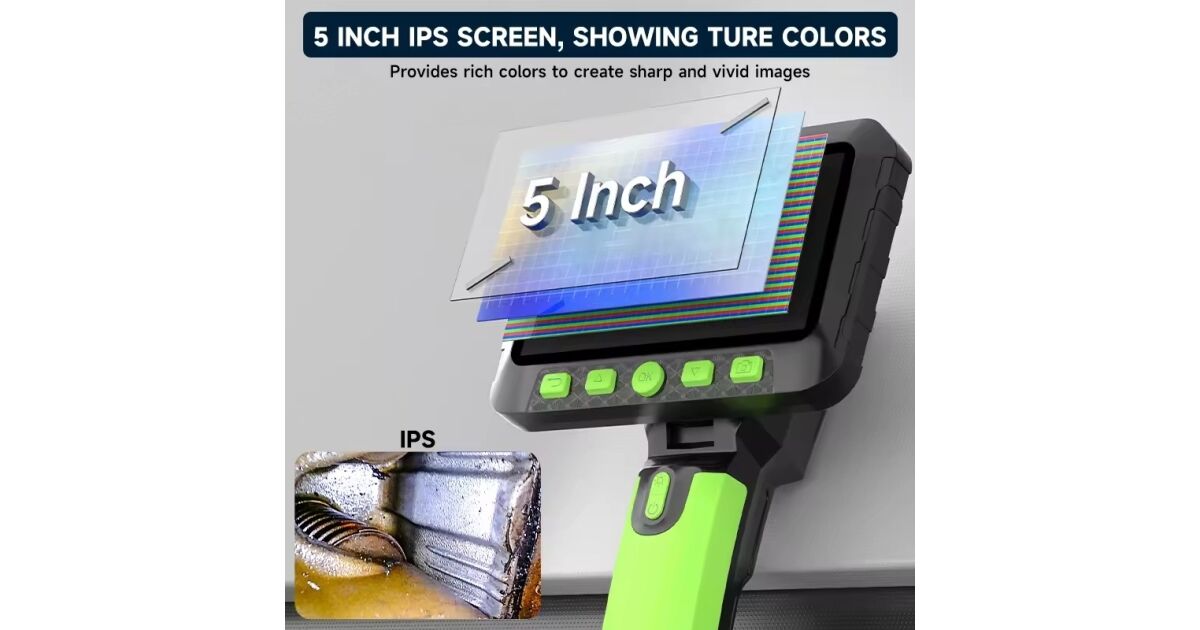 IUni ROT50 Industrielle Auto-Inspektionskamera, 180° drehbar, 5-Zoll-LCD-Bildschirm, 1080P, halbstarres Kabel, 1 m Länge, 8+1 einstellbare LEDs, IP67-Wasserbeständigkeit, 5000 mAh Beschreibung