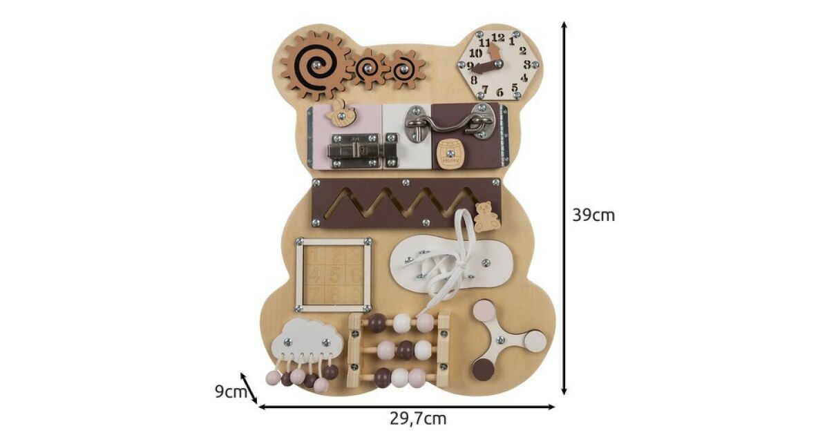 - 14 interaktive Elemente: Uhr, Griffe, Labyrinth, Zahlen, Abakus und vieles mehr!