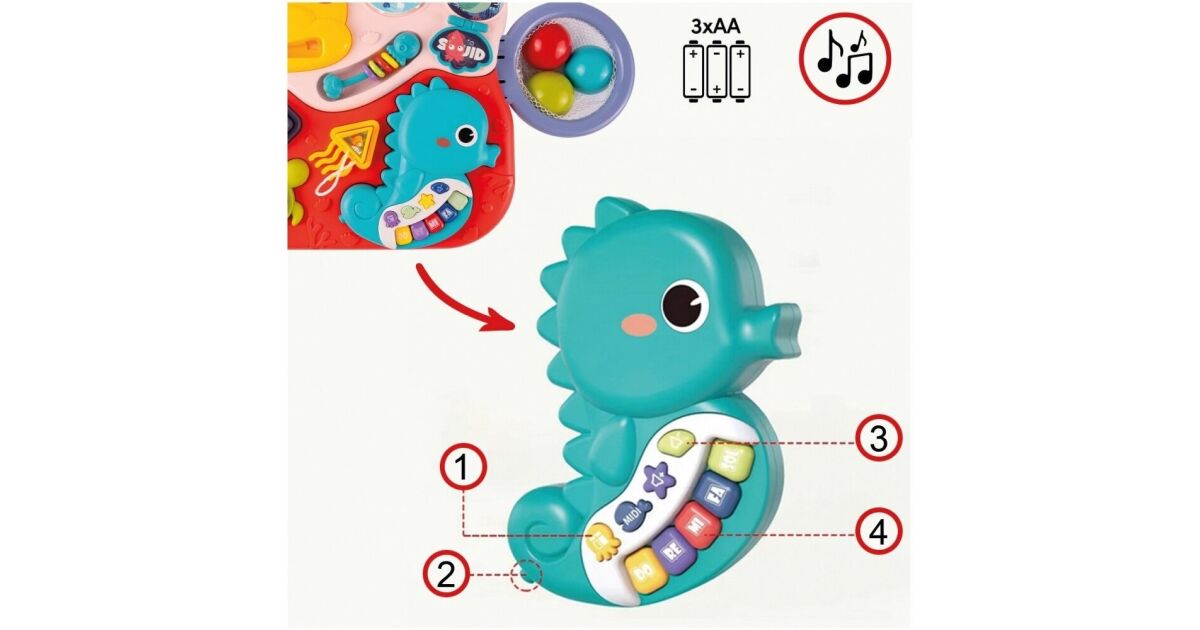 - 🎹 Musikalisches Klavier: Ein Seepferdchen-förmiges Klavier mit Tiergeräuschen und Melodien, das das Gehör und den Rhythmusgefühl entwickelt. Die LED-Leuchten sorgen für visuelle Reize.
