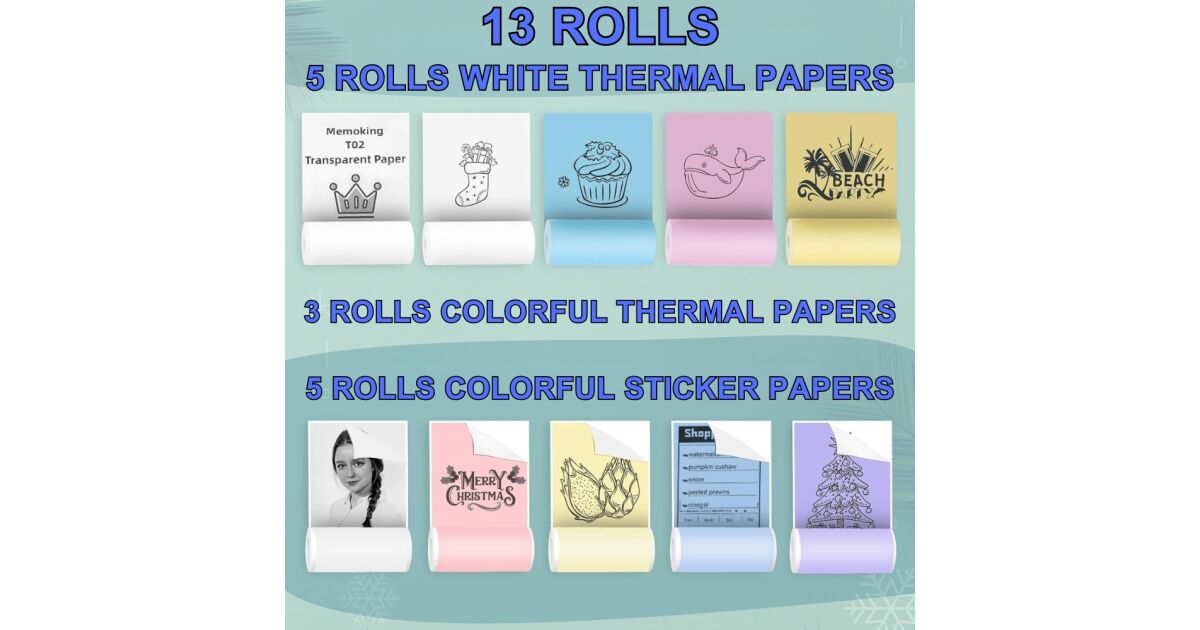 - 13 Rollen Thermopapier (5 weiße, 3 farbige, 5 farbige Kleberollen)