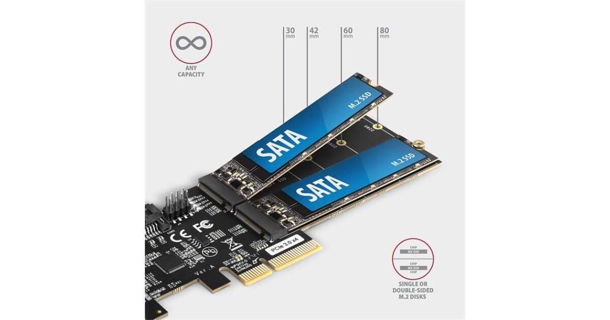 Diese Axagon PCES-SA4M2 PCI-Express Erweiterungskarte erweitert ganz einfach die Speicherkapazität deines Computers. Sie verfügt über zwei interne SATAIII-Ports und zwei SATA M.2-Steckplätze, sodass du mehrere Festplatten oder SSDs anschließen kannst.