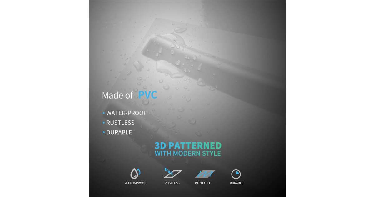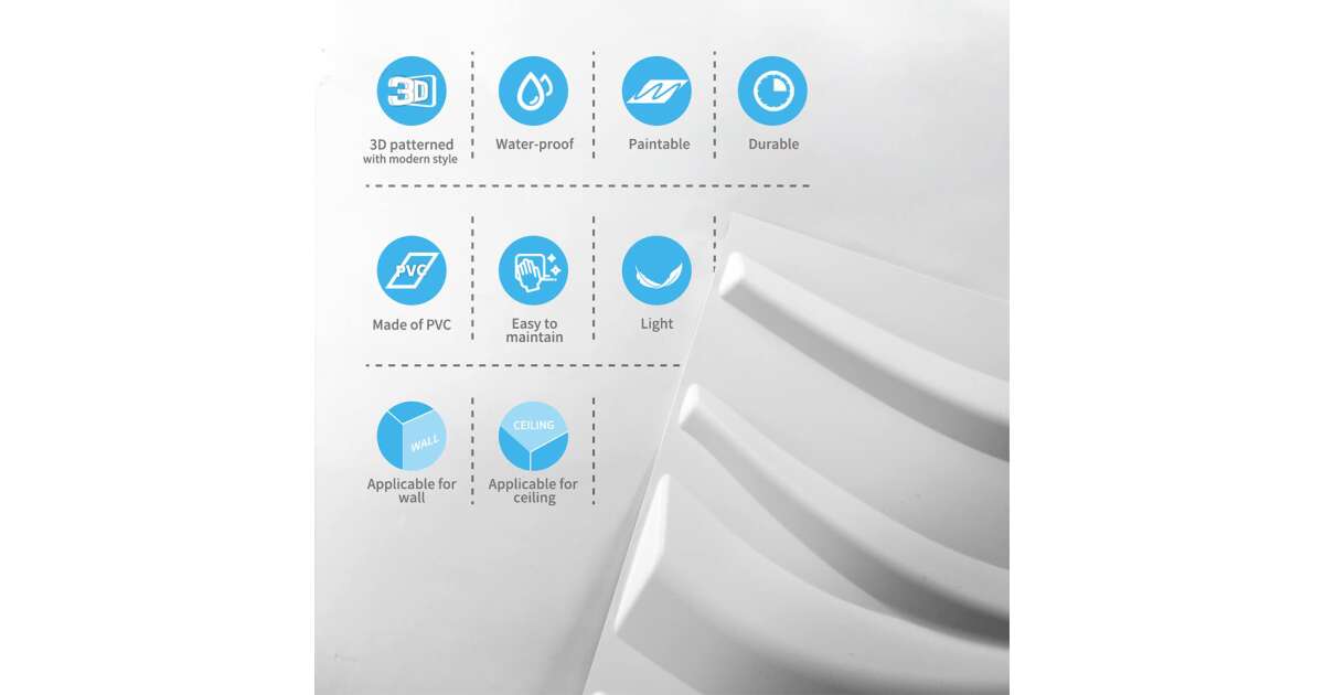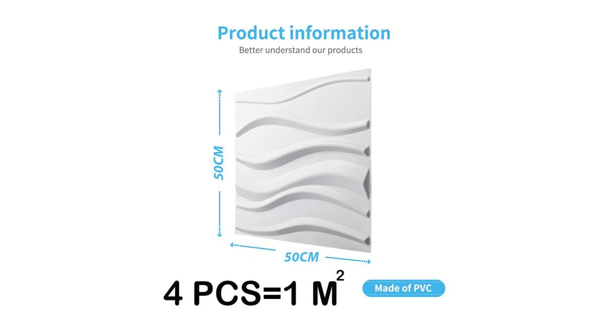 Dieses 3D Wellen-Wandpaneel verleiht deinem Zuhause einen modernen und eleganten Look. Es ist einfach zu montieren, wasserfest und überstreichbar – perfekt für Wohnzimmer, Schlafzimmer oder sogar Büros. Die Packung enthält vier Paneele, die zusammen 1 Quadratmeter abdecken.