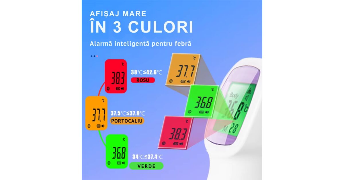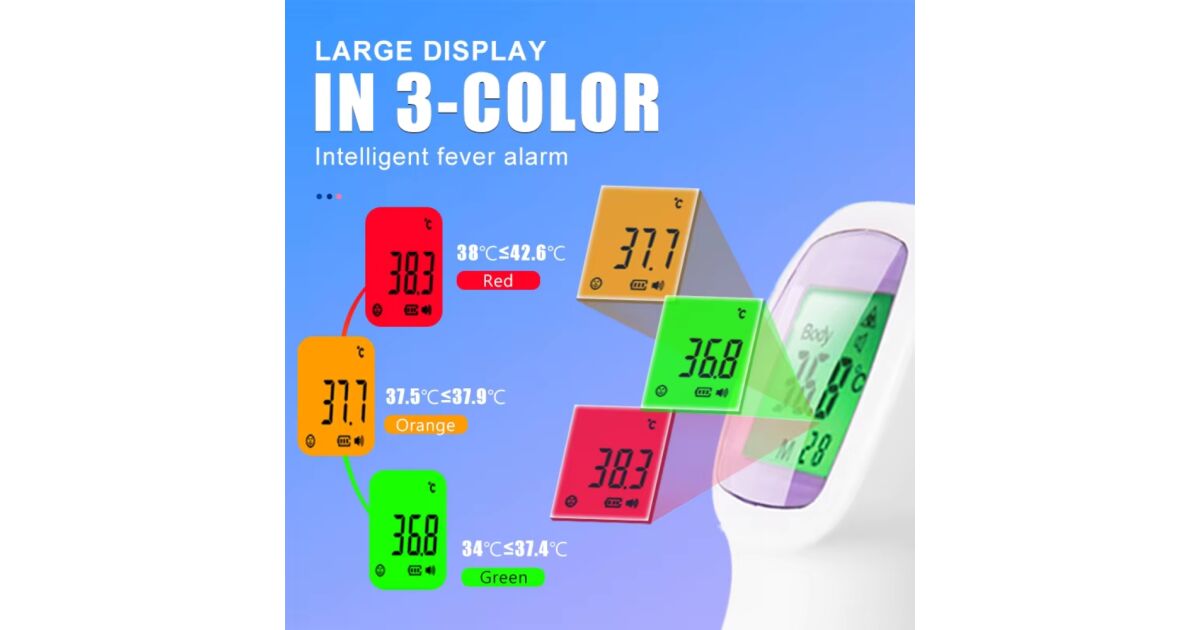 - 🌈 Farbige LCD-Anzeige: Leicht verständliche Anzeige (grün: normal, orange: erhöhte Temperatur, rot: Fieber).