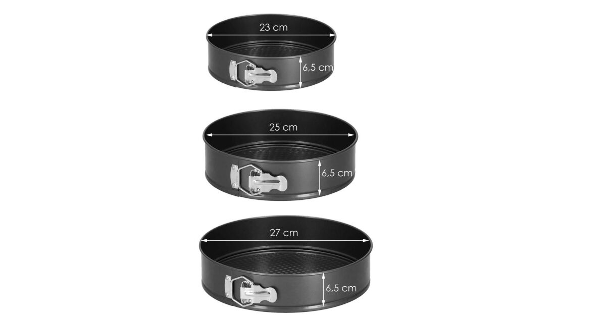 Dieses Springos Backform-Set enthält drei hochwertige Kuchenformen in verschiedenen Größen, mit denen Sie mühelos leckere Kuchen und Torten zubereiten können. Die graphitfarbene Farbe verleiht Ihrer Küche ein elegantes Aussehen, und der abnehmbare Boden erleichtert das Herausnehmen der Kuchen.