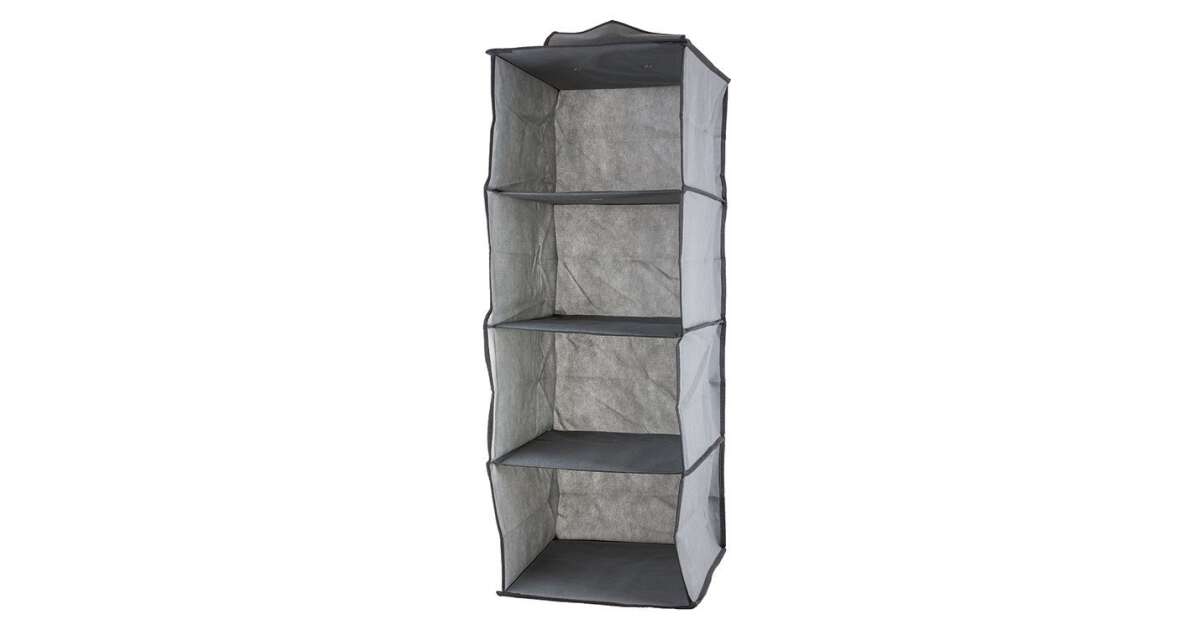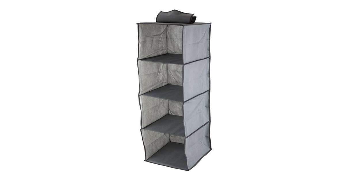 Dieses praktische Hänge-Regal mit 4 Ebenen ist die perfekte Lösung für Platzmangel im Kleiderschrank. Es ist einfach zu montieren und hilft dir, Ordnung in deiner Kleidung und deinen Accessoires zu halten. Die graue Farbe ist universell und passt in jeden Kleiderschrank.