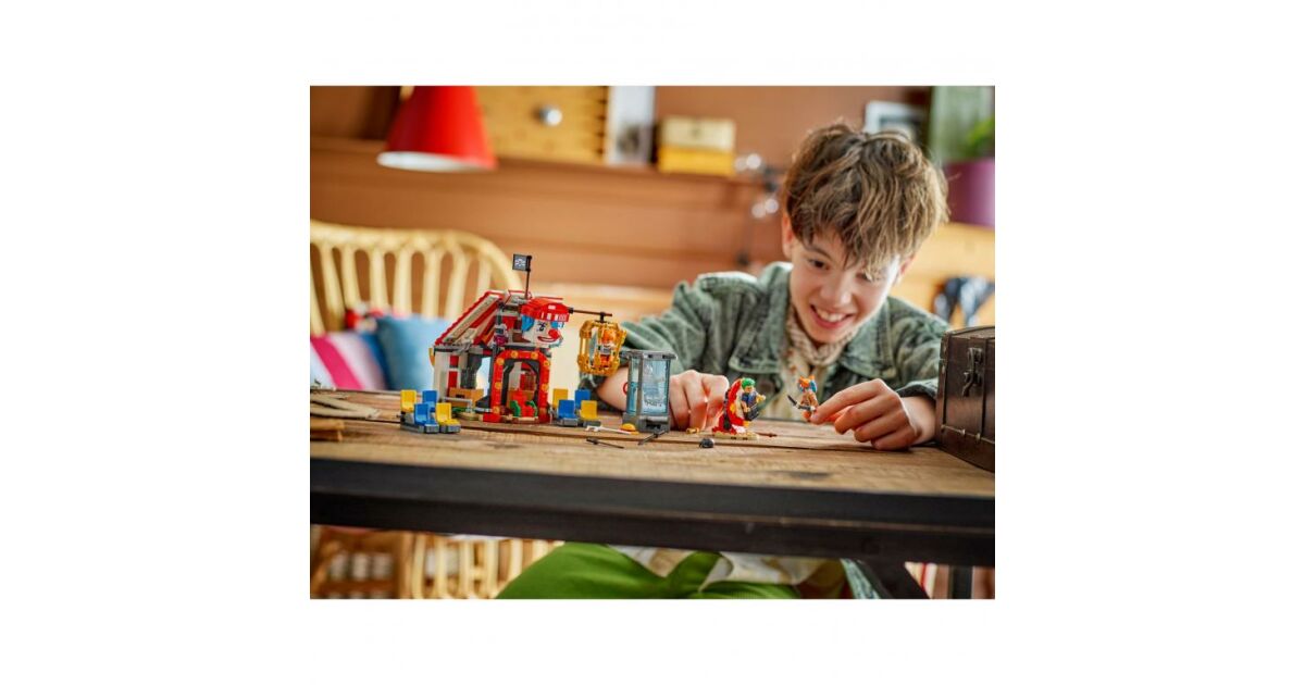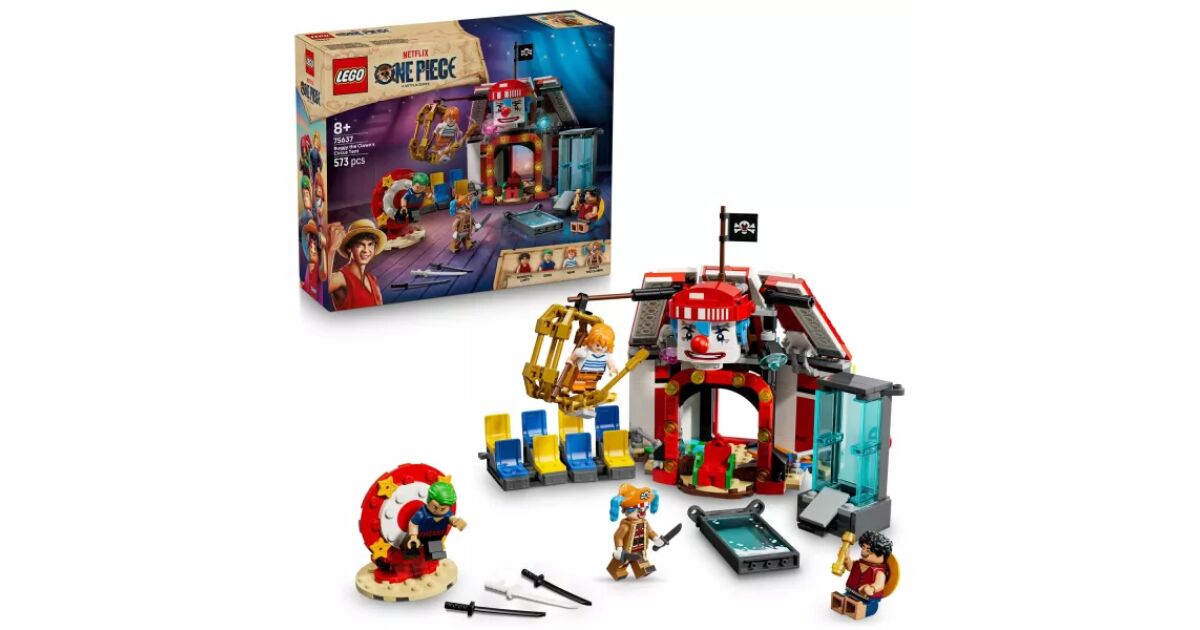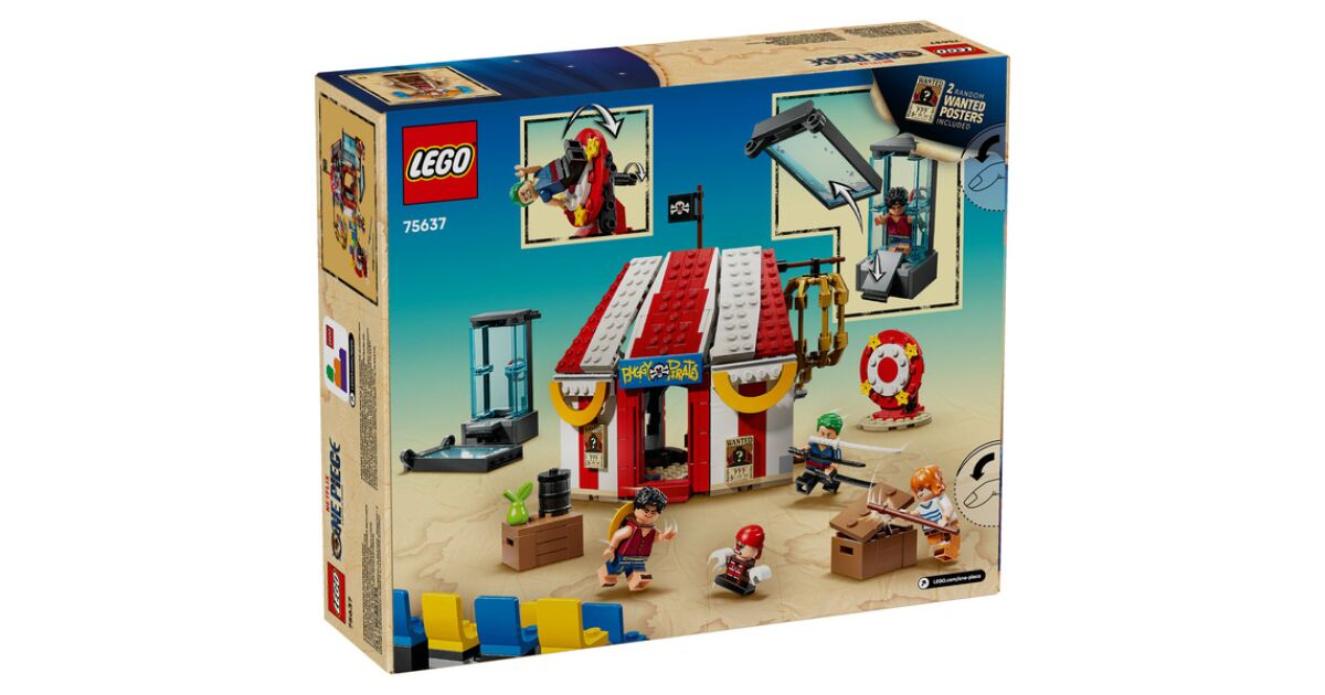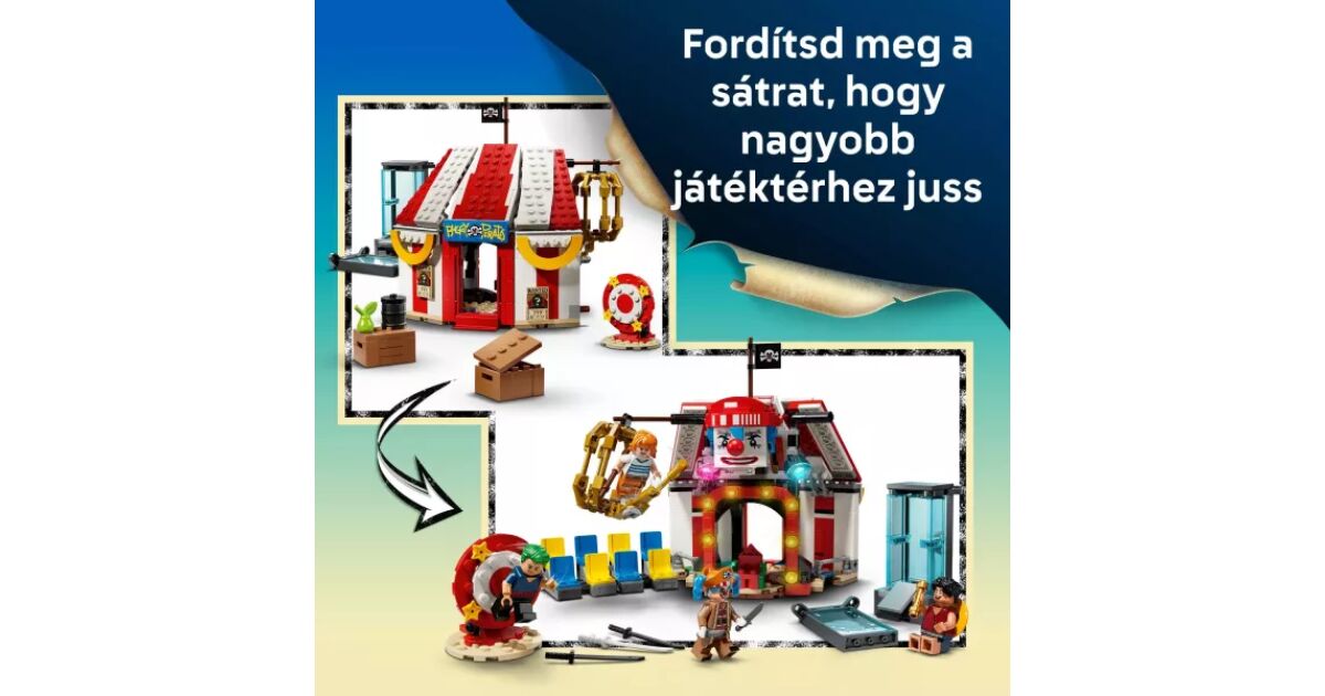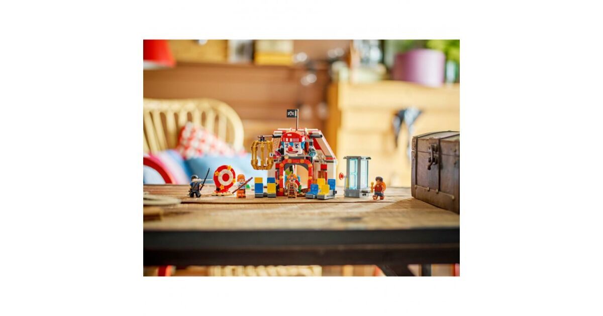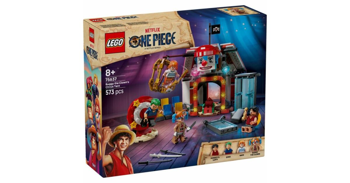 Zum Set gehören die Minifiguren von Luffy, Zoro, Nami und dem Piratenkapitän Bugsy, der Clown. Das baubare Zelt kann gedreht werden, um eine größere Spielfläche zu schaffen, auf der abnehmbare Stühle stehen und Bugsy's Thron zu finden ist. Die Helden werden von 3 Zirkusstrukturen gefangen: einem Wassertank, einem drehbaren, vertikalen Tisch und einem hängenden Käfig. Die im Zelt befindlichen Kisten und Fässer enthalten Elemente, aus denen Bugsys kleinere Version gebaut werden kann. Das Set enthält viele coole Waffen und zahlreiche Zubehörteile, darunter 2 „Wanted“ (gesucht) Plakate. Wenn die Baumeister ein zusätzliches digitales Erlebnis wünschen, können sie in der intuitiven LEGO Builder-App die Modelle vergrößern und in 3D drehen sowie ihren Fortschritt verfolgen. Dieses Set besteht aus 573 Elementen.