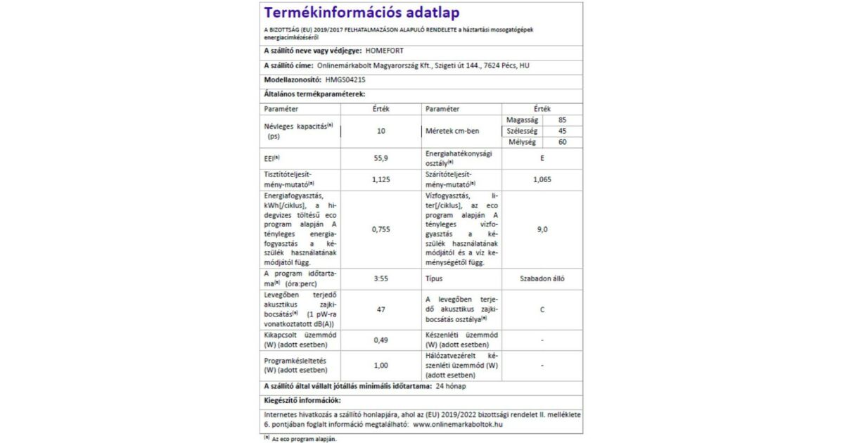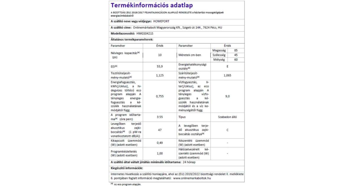 HOMEFORT HMGS0421S Szabadonálló mosogatógép 10 teríték,9 L,7 prog.,47 dB,E,Felső evőeszk.,45 cm,Digit.Kijelző, Autom.ajtónyit.nélkül Beschreibung