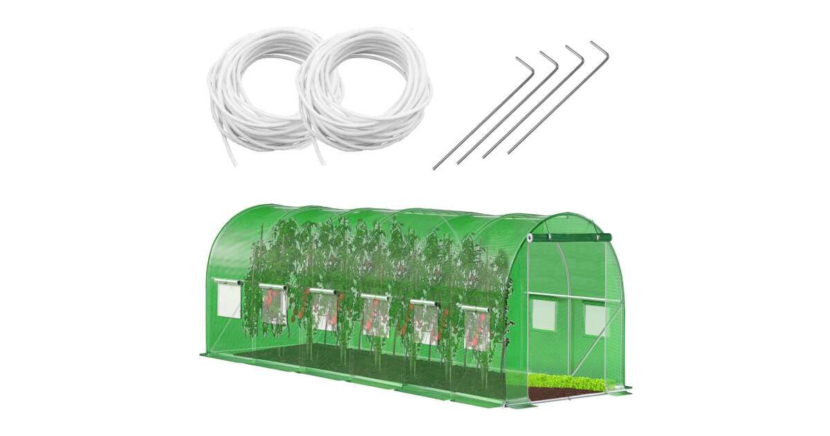 Dieser große Springos® Gewächshaustunnel mit den Maßen 6x3x2 Meter ist die ideale Lösung, um Ihre Pflanzen vor Wind, Regen und Schädlingen zu schützen. Sein robustes, verzinktes Metallgestell und die strapazierfähige Polyethylenfolie mit UV4-Schutz garantieren eine lange Lebensdauer. Die 13 Fenster mit Moskitonetzen sorgen für eine gute Belüftung, während die Reißverschlusstüren einen einfachen Zugang zu den Pflanzen ermöglichen.
