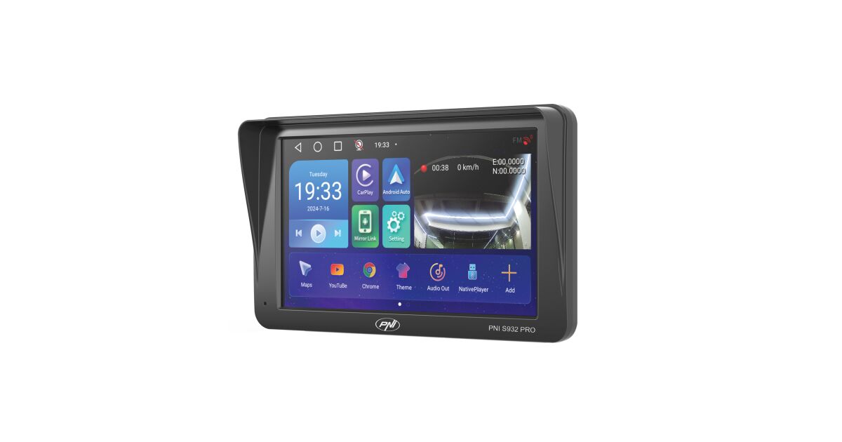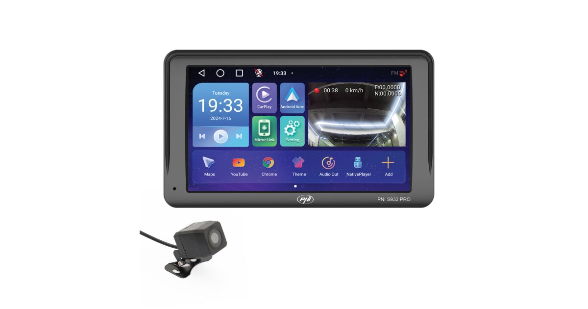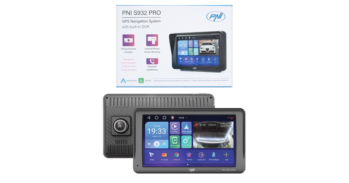 GPS-Navigationssystem mit integriertem DVR PNI S932 PRO 7-Zoll-Bildschirm, 32 GB Speicher, 2 GB DDR3 RAM, Android 13, FM-Transmitter, Mirror Link, Apple Carplay und Android Auto, Rückfahrkamera inklus Beschreibung