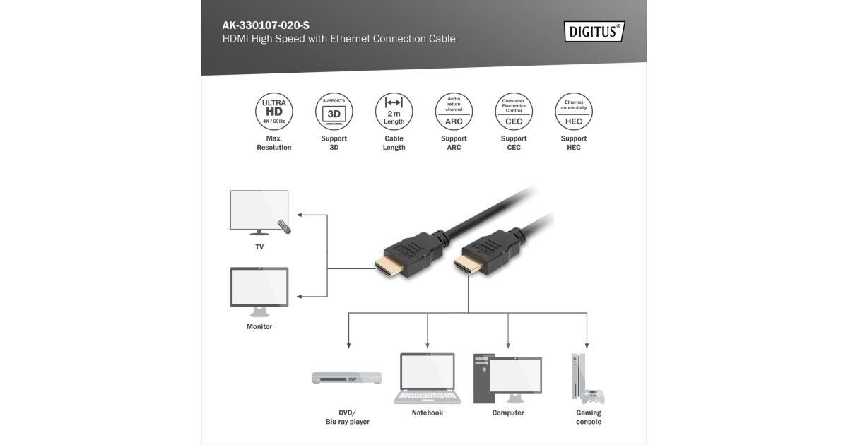 DIGITUS HDMI High Speed with Ethernet Connecting Cable - HDMI Type-A Male/HDMI Type-A Male - 5 m (AK-330107-020-S) Beschreibung
