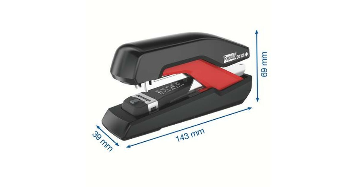 Dieser kompakte, schwarz-rote RAPID Supreme OmniPress S030c Hefter verfügt über die revolutionäre Omnipress™-Technologie für müheloses und komfortables Heften. Ob auf dem Schreibtisch oder in der Hand, zum Heften kann er an jeder Stelle der Oberfläche heruntergedrückt werden.