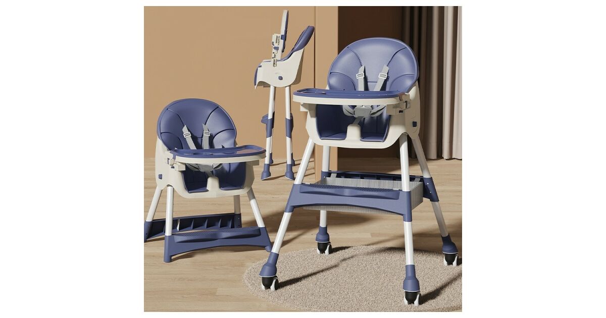 Flippy Hochstuhl für Babys und Kinder, mit Rädern, teleskopisch, faltbar, verstellbarer Tisch, Fußstütze, Sitz mit Kunstleder bezogen, Sicherheitsgurt, Stauraum, 97 x 73 x 65 cm, blau Beschreibung