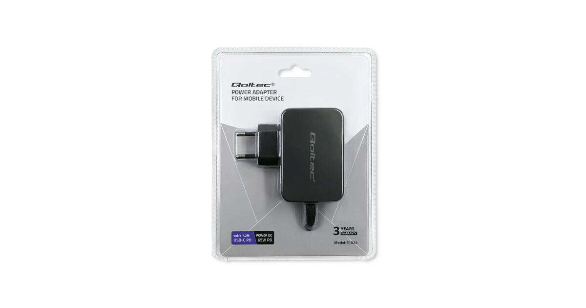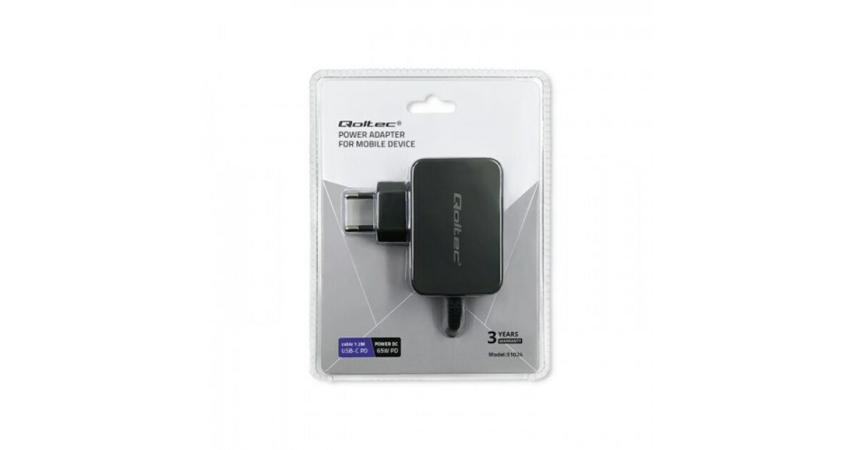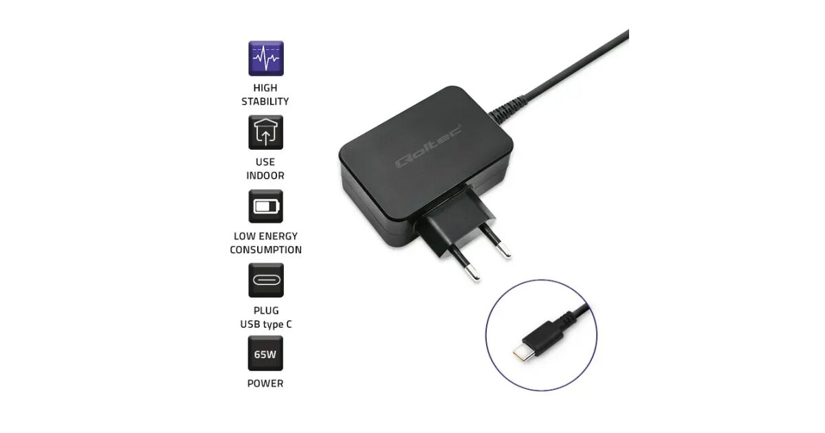 Qoltec Netzladegerät 65W | 5-20V | 3-3,25A | USB Typ-C | PD | Schwarz