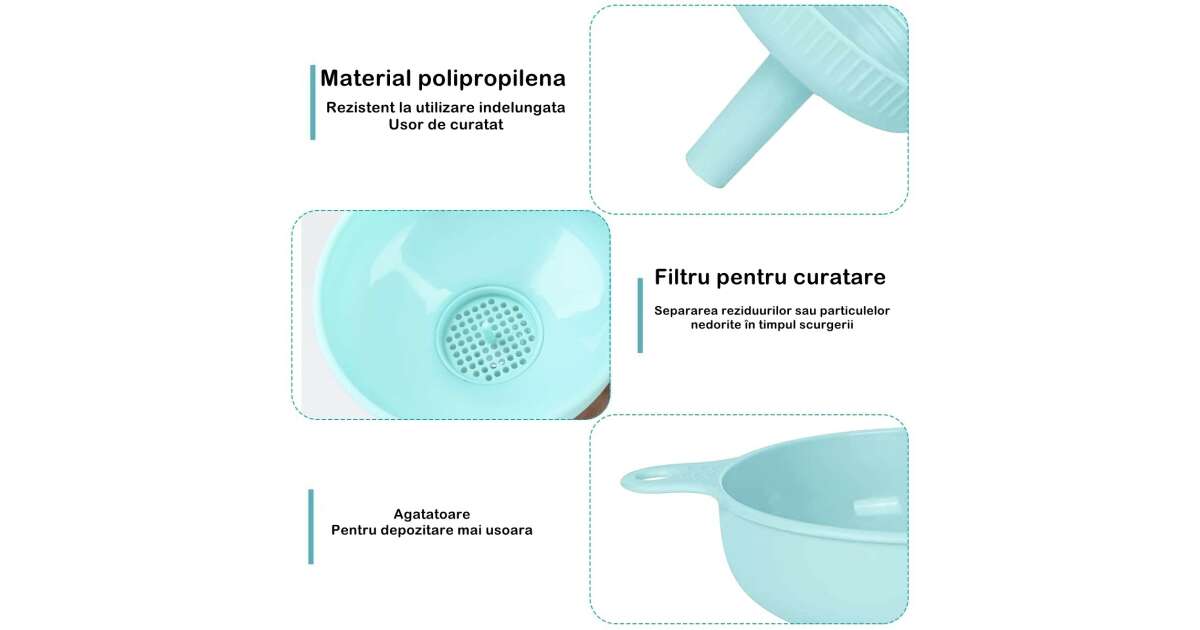 - Zwei Ablaufgrößen: 5,4 cm Durchmesser für feine Flüssigkeiten, größere Öffnung für größere Mengen.