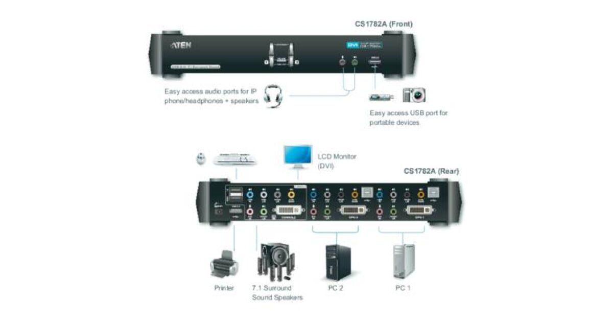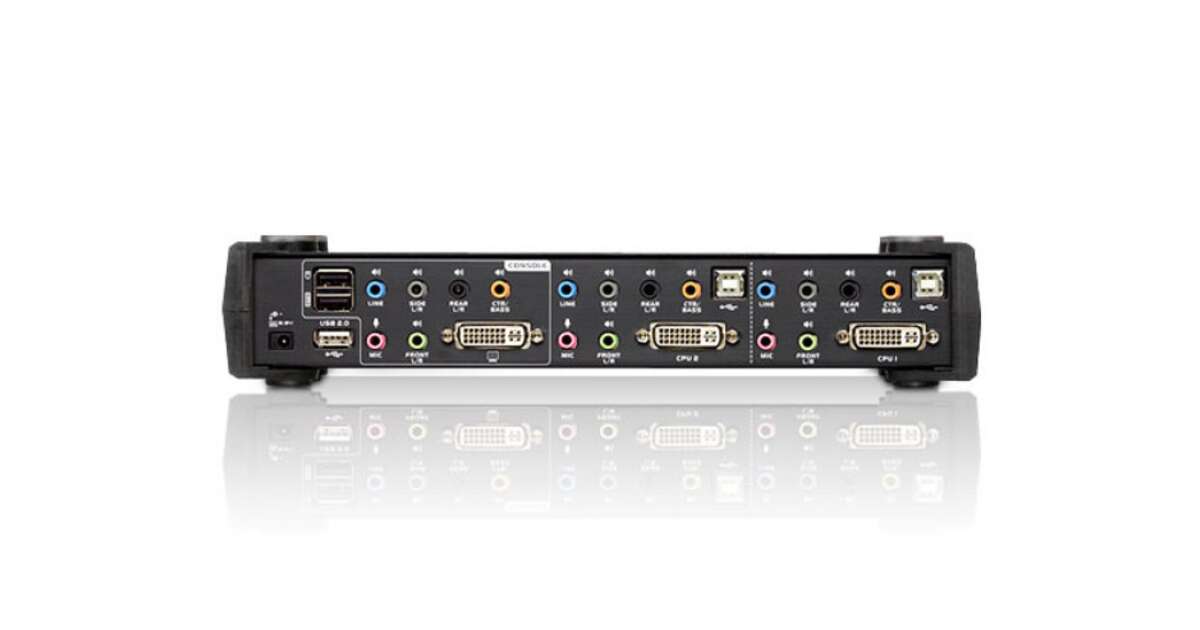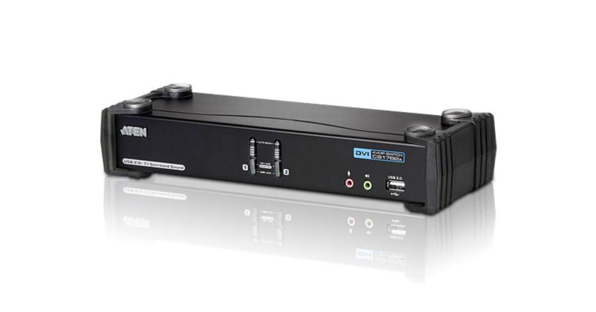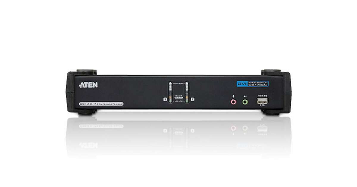 Der CS1782A USB DVI Dual Link KVMP™ KVM-Switch vereint in einem Gerät einen 2-Port-KVM-Switch und einen 2-Port-USB-Hub und bietet Unterstützung für DVI-Videosignal und -Sound. Darüber hinaus verfügt er über erweiterte Funktionen wie nVidia 3D Vision ready 120-Hz-3D-Display-Unterstützung, Kompatibilität mit Gaming-Tastaturen und Maus-Port-Umschaltung. 2-Port-DVI-KVMP-Switch mit USB 2.0 und 7.1-Surround-Sound. 1 USB-Konsole steuert 2 Computer und 2 zusätzliche USB-Geräte. 2-Port-integrierter USB 2.0-Hub. Voller Bass Ansprechverhalten für hochwertigen 7.1-Kanal-Surround-Sound. Umschalten über Tasten auf der Vorderseite, Tastaturkürzel und Maus. Unterstützung mehrerer Plattformen – Windows, Linux, Mac und Sun*. Unabhängige Umschaltung von KVM, USB und Audio-Fokus. Unterstützt digitale und analoge DVI-Monitore – volle Kompatibilität mit DVI-Spezifikationen Hervorragende Videoqualität: 1920 x 1200 bei 60 Hz (Single Link); 2560 x 1600 bei 60 Hz (Dual Link) nVidia 3D Vision Ready: Funktioniert mit 120-Hz-LCD-Monitoren und aktiven Shutter-Brillen, um eine 3D-Umgebung mit einer maximalen Auflösung von bis zu 1920 x 1080 zu schaffenHDCP-Kompatibilität Unterstützt Breitbildauflösungen Video DynaSync™ – ein exklusives ATEN Technologie, die Probleme mit der Anzeige beim Neustart beseitigt und die Auflösung beim Umschalten zwischen Ports optimiert. Einschalterkennung – wenn einer der Computer ausgeschaltet ist, schaltet der Switch automatisch auf die nächste verfügbare Konsolen-Maus-Port-Emulations-/Bypass-Option um – unterstützt die meisten Maustreiber und Multifunktionsmäuse Konsolentastatur-Emulation/Bypass-Option – unterstützt die meisten Gaming-/Multimedia-Tastaturen Vollständige Tastaturemulation für problemlosen Neustart Mac/Sun-Tastaturunterstützung und -emulation*Mehrsprachige Tastaturzuordnung – unterstützt englische, japanische und französische Tastaturen Automatischer Scan-Modus zur Überwachung aller Computer Unterstützt Firmware-Update Hersteller: Aten Garantie: 24 Monate Audio: Ja Anzahl der Anschlüsse: 2Typ-Anschlüsse: USB, 3,5-mm-Buchse, DVIKabel: Ja