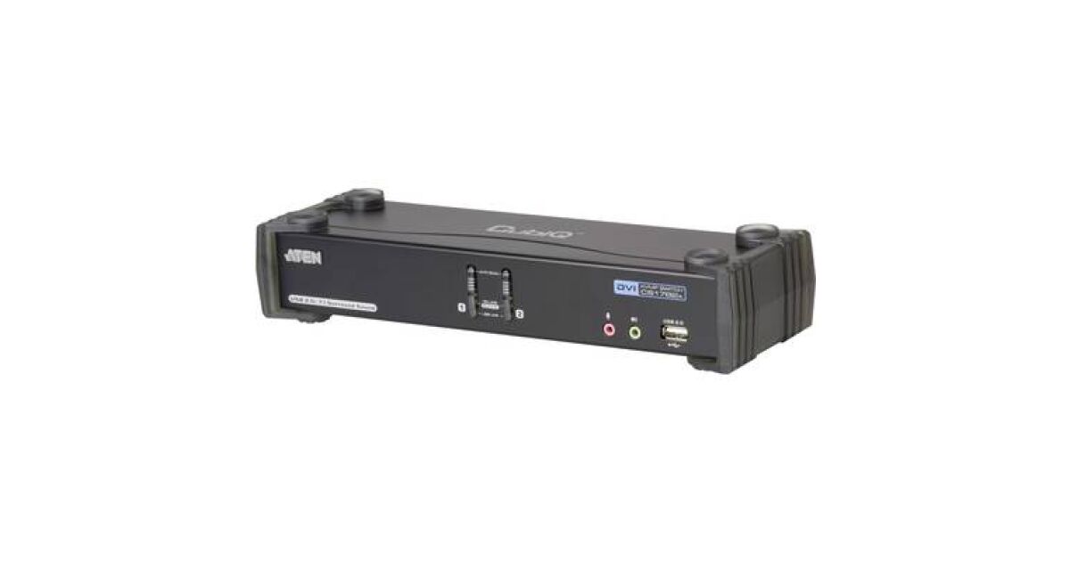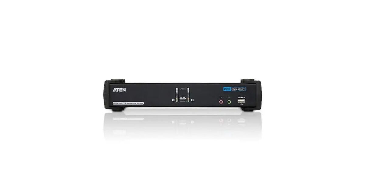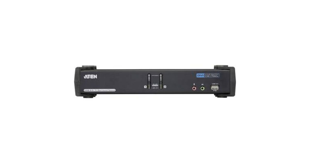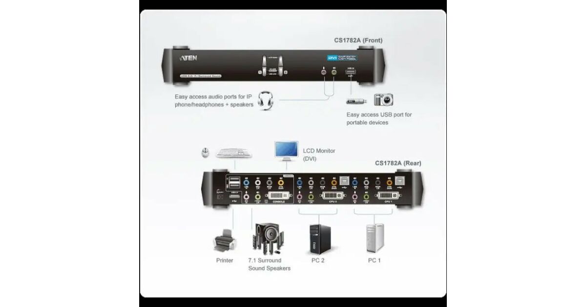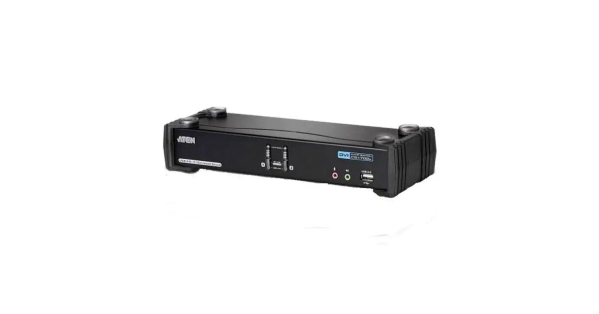 Der CS1782A USB DVI Dual Link KVMP™ KVM-Switch vereint in einem Gerät einen 2-Port-KVM-Switch und einen 2-Port-USB-Hub und bietet Unterstützung für DVI-Videosignal und -Sound. Darüber hinaus verfügt er über erweiterte Funktionen wie nVidia 3D Vision ready 120-Hz-3D-Display-Unterstützung, Kompatibilität mit Gaming-Tastaturen und Maus-Port-Umschaltung. 2-Port-DVI-KVMP-Switch mit USB 2.0 und 7.1-Surround-Sound. 1 USB-Konsole steuert 2 Computer und 2 zusätzliche USB-Geräte. 2-Port-integrierter USB 2.0-Hub. Voller Bass Ansprechverhalten für hochwertigen 7.1-Kanal-Surround-Sound. Umschalten über Tasten auf der Vorderseite, Tastaturkürzel und Maus. Unterstützung mehrerer Plattformen – Windows, Linux, Mac und Sun*. Unabhängige Umschaltung von KVM, USB und Audio-Fokus. Unterstützt digitale und analoge DVI-Monitore – volle Kompatibilität mit DVI-Spezifikationen Hervorragende Videoqualität: 1920 x 1200 bei 60 Hz (Single Link); 2560 x 1600 bei 60 Hz (Dual Link) nVidia 3D Vision Ready: Funktioniert mit 120-Hz-LCD-Monitoren und aktiven Shutter-Brillen, um eine 3D-Umgebung mit einer maximalen Auflösung von bis zu 1920 x 1080 zu schaffenHDCP-Kompatibilität Unterstützt Breitbildauflösungen Video DynaSync™ – ein exklusives ATEN Technologie, die Probleme mit der Anzeige beim Neustart beseitigt und die Auflösung beim Umschalten zwischen Ports optimiert. Einschalterkennung – wenn einer der Computer ausgeschaltet ist, schaltet der Switch automatisch auf die nächste verfügbare Konsolen-Maus-Port-Emulations-/Bypass-Option um – unterstützt die meisten Maustreiber und Multifunktionsmäuse Konsolentastatur-Emulation/Bypass-Option – unterstützt die meisten Gaming-/Multimedia-Tastaturen Vollständige Tastaturemulation für problemlosen Neustart Mac/Sun-Tastaturunterstützung und -emulation*Mehrsprachige Tastaturzuordnung – unterstützt englische, japanische und französische Tastaturen Automatischer Scan-Modus zur Überwachung aller Computer Unterstützt Firmware-Update Hersteller: Aten Garantie: 24 Monate Audio: Ja Anzahl der Anschlüsse: 2Typ-Anschlüsse: USB, 3,5-mm-Buchse, DVIKabel: Ja