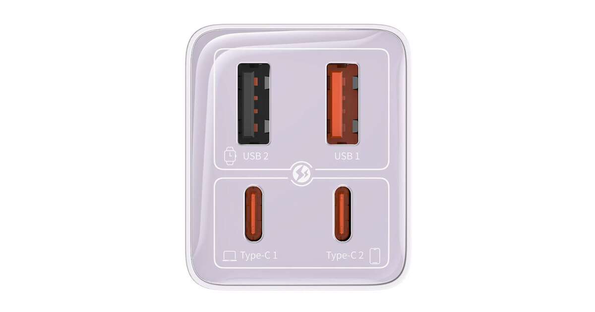 Baseus GaN6 Pro Wandladegerät, 65 W, 2 x USB und 2 x USB-C, Schnellladung, USB-C-auf-USB-C-Kabel, Lila Beschreibung