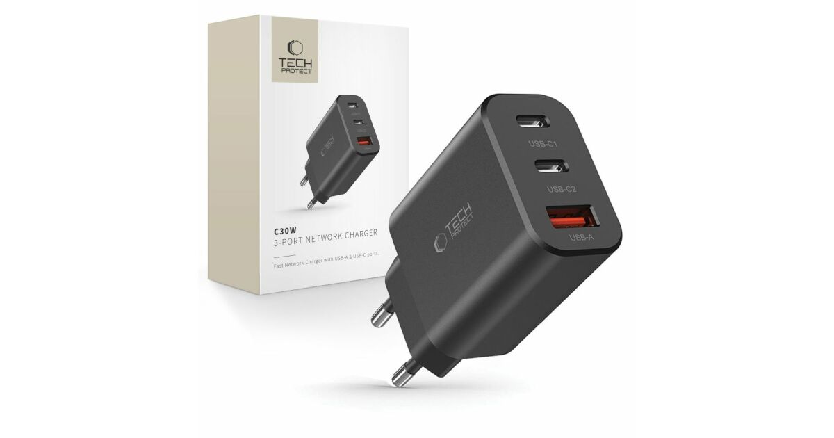 Tech-protect C30W 3-Port-Netzwerkladegerät PD 30W QC 3.0 Schwarz