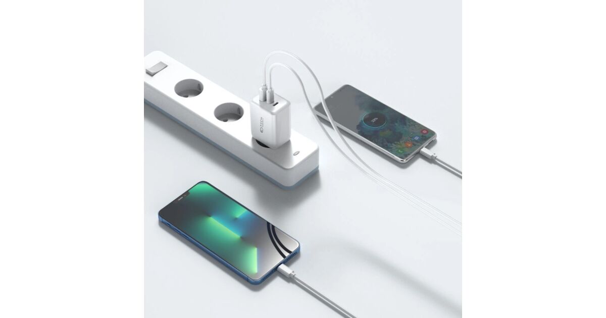 Dieses kompakte, weiße Tech-Protect C65W Wandladegerät ist die perfekte Lösung, um Smartphones, Tablets, tragbare Konsolen und Powerbanks gleichzeitig aufzuladen. Mit zwei USB-C (PD65W) und einem USB-A (QC3.0) Anschluss kannst du bis zu drei Geräte gleichzeitig laden.