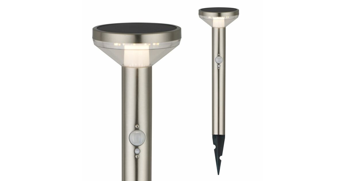 Solar-LED-Lampe mit Maclean-Sensor MCE465 C/M, mattes Chrom, IP44, 3 Lichtmodi, Li-Ion-18650-Batterie 3,7 V 1200 mAh, angetrieben