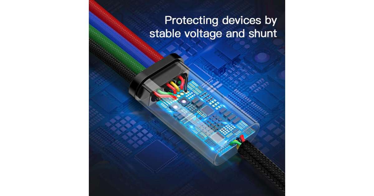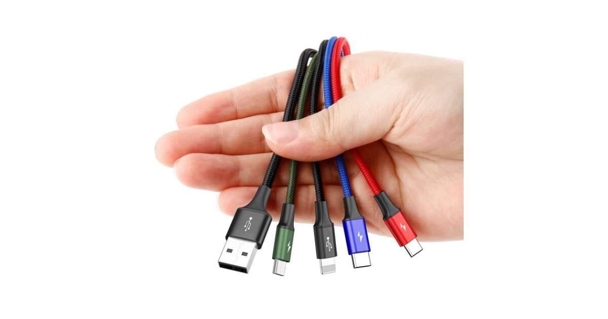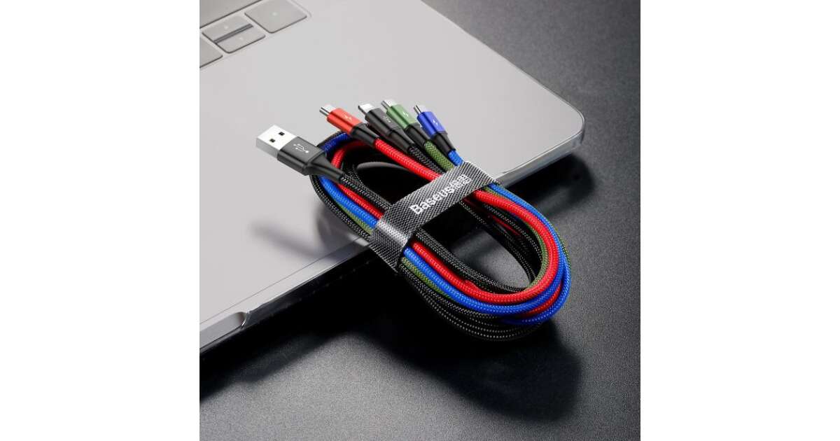 Mit dem hochwertigen Kabel können Sie schnell und einfach vier Geräte gleichzeitig aufladen - zwei mit Lightning-Anschlüssen und je eines mit USB-C- und Micro-USB-Anschlüssen. Zusätzlich unterstützt ein Lightning-Kabel die Datenübertragung. Jedes Kabel hat eine andere Farbe, so dass man sie leicht unterscheiden kann. Das Kabel unterstützt das Aufladen mit bis zu 3,5 A (max. 2 A pro Kabel) und ist dank seiner breiten Kompatibilität vielseitig einsetzbar. Die Aluminiumspitzen sind sehr langlebig und der Nylongeflechtschlauch ist widerstandsfähig gegen Beschädigungen und Abrieb und verhindert Verwicklungen. Der mitgelieferte Kabelbinder erleichtert die Aufbewahrung und Organisation des Kabels.