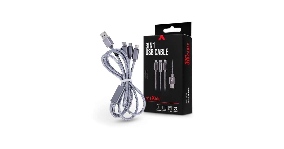 Maxlife 3-in-1-Daten- und Ladekabel, Micro-USB/Typ C/Lightning-Nylon-ummantelt, kompatibel mit schnellem Laden, 2,1 A, Grau