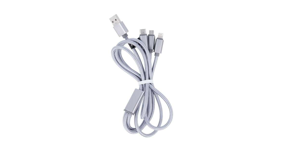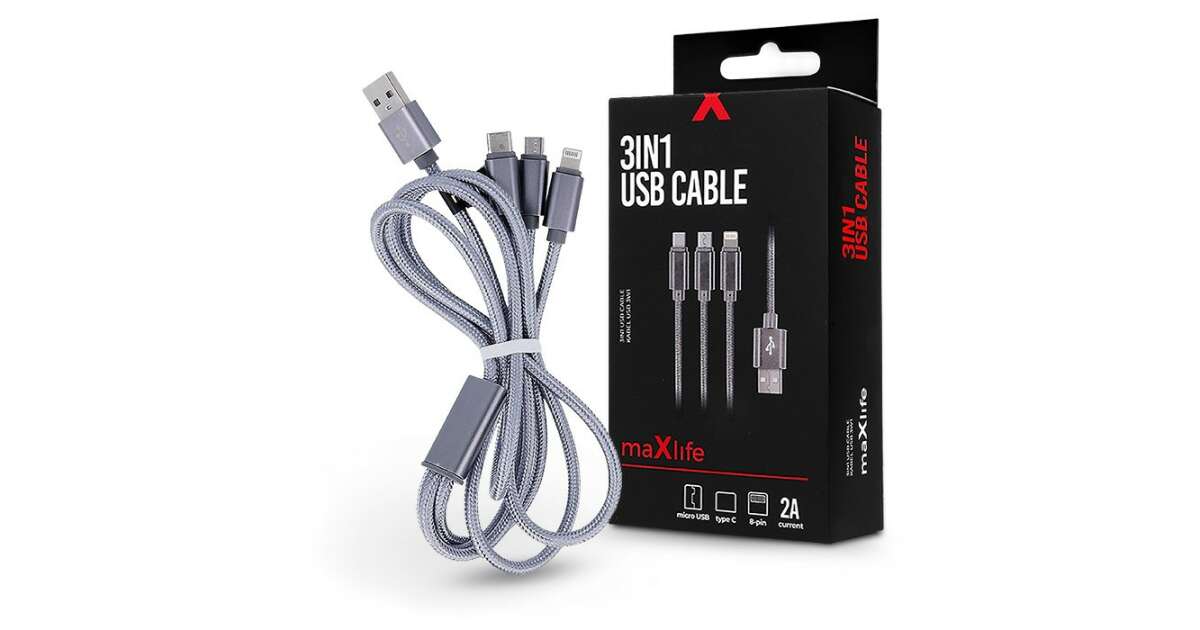 Maxlife 3-in-1-Daten- und Ladekabel, Micro-USB/Typ C/Lightning-Nylon-ummantelt, kompatibel mit schnellem Laden, 2,1 A, Grau Beschreibung