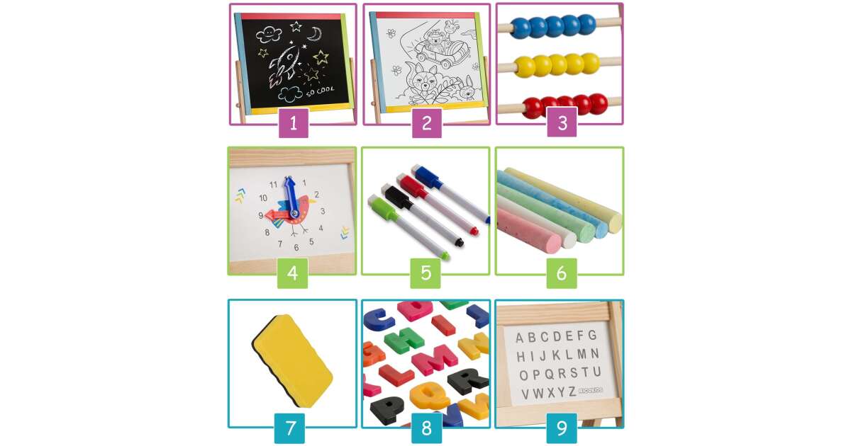 - 🎨 Zubehör: farbige Kreide, löschbare Stifte, Schwamm
