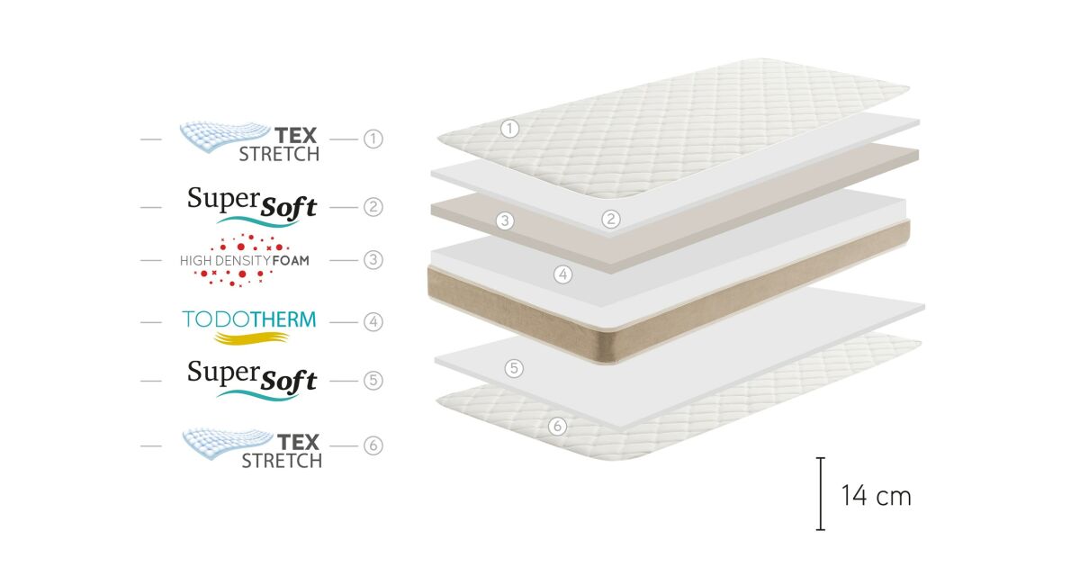 - Druckverteilung: Jede Schicht der Matratze ist so konzipiert, dass sie den Druck gleichmäßig verteilt und die Entstehung von Druckpunkten verhindert.