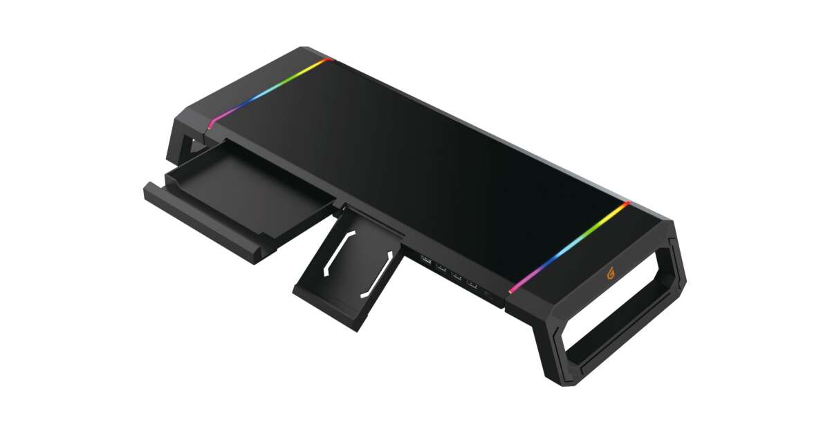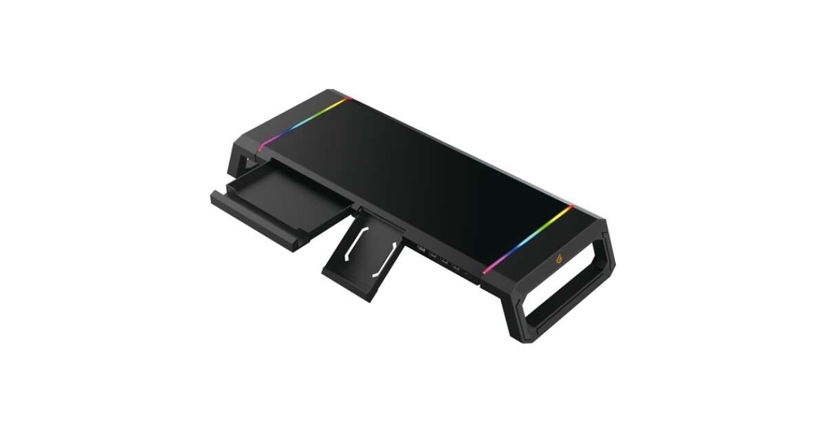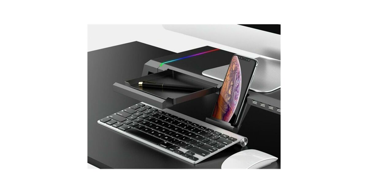 Er ist eine äußerst praktische, platzsparende und ergonomische Lösung für deinen Monitor. Die eingebauten USB-Anschlüsse und die Schublade bieten zusätzlichen Komfort, während die RGB-Beleuchtung deinem Schreibtisch ein stilvolles Aussehen verleiht. Der integrierte Handyhalter sorgt für zusätzlichen Komfort im Alltag. Er verbessert die Körperhaltung, reduziert Nacken- und Augenermüdung und sorgt für Ordnung auf deinem Schreibtisch. Ein echtes Multifunktionsgerät für Gamer und Heimanwender gleichermaßen!
