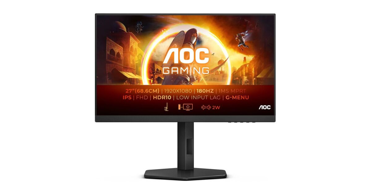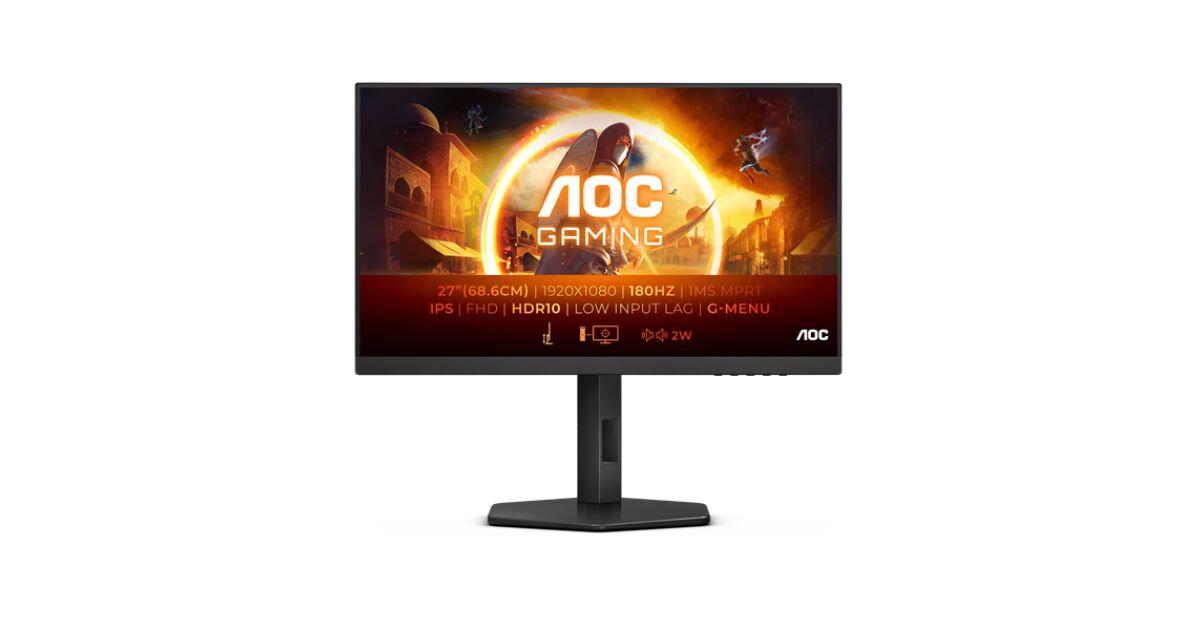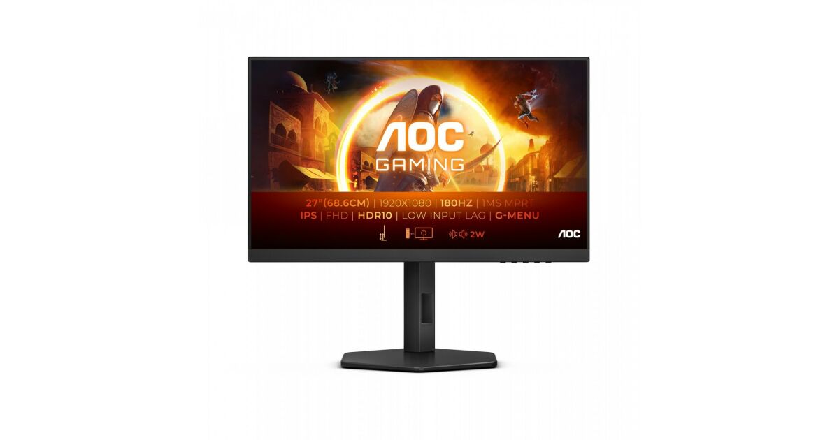 AOC 27G4X, Bildschirmdiagonale: 68,6 cm (27"), Bildschirmauflösung: 1920 x 1080 Pixel, HD-Typ: Full HD, Display-Technologie: LED, Reaktionszeit: 0,5 ms, Seitenverhältnis: 16:9, Horizontaler Blickwinkel: 178°, Vertikaler Blickwinkel: 178°. Eingebaute(r) Lautsprecher. VESA-Befestigung, Höhenverstellung. Produktfarbe: Schwarz