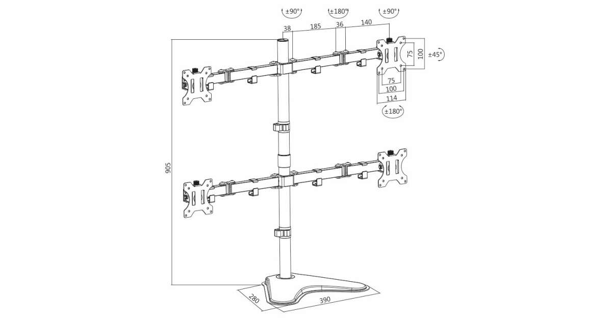 - Verstellbare Arme: -45°/+45° Neigung, -90°/+90° Drehung, -180°/+180° Schwenkung.