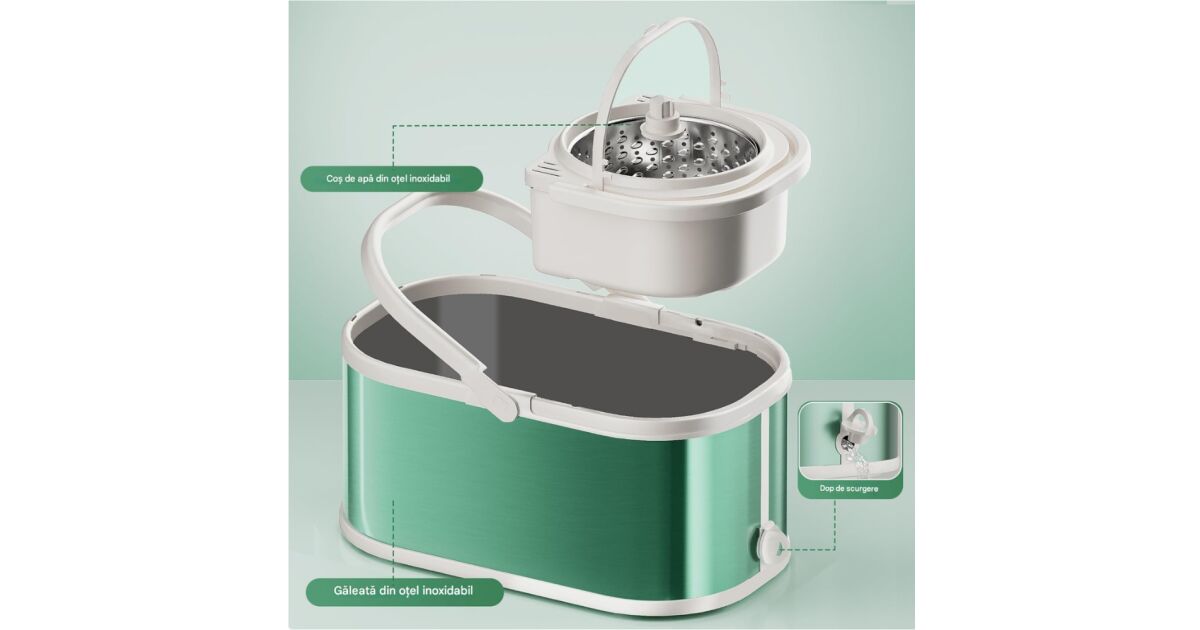 Arvada® MagicClean Edelstahl-Wischmopp-Eimer-Set mit 360-Grad-Drehung, ovaler Eimer, Maße 42 x 26 x 22 cm, glänzende Oberfläche und Wasserablaufloch mit 4 Nachfüllpackungen, weiß, mintgrün Beschreibung