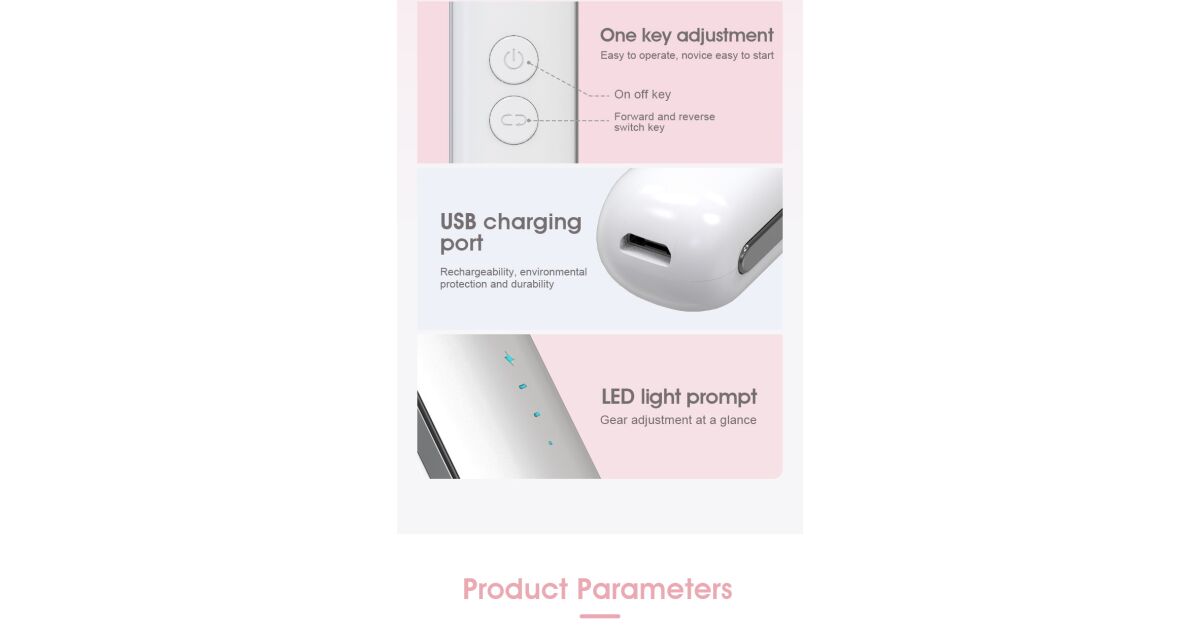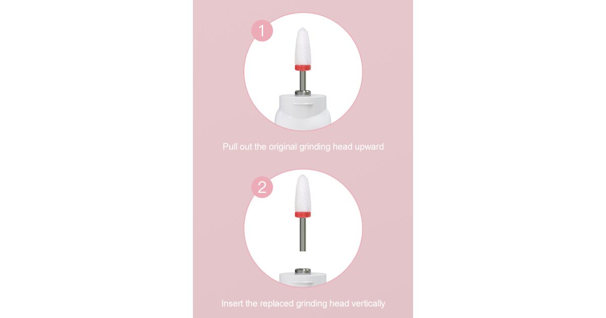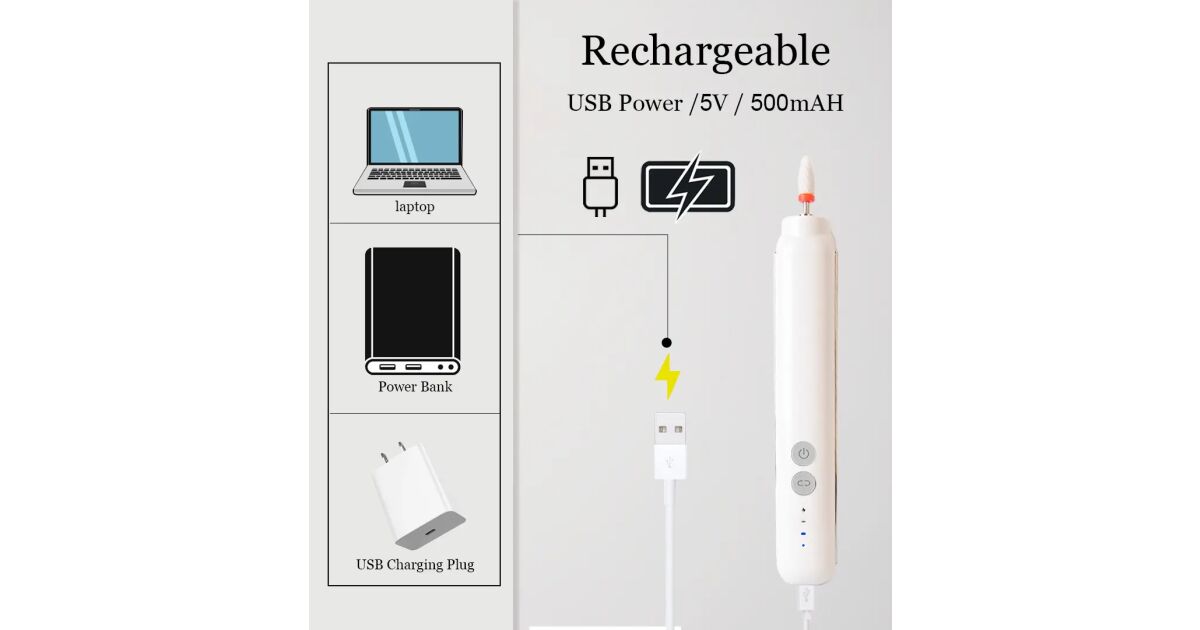 Anbringen der Feilenköpfe: Ziehen Sie den montierten Kopf ab und setzen Sie den gewünschten neuen Kopf bis zum Anschlag ein. Einschalten des Geräts: Drücken Sie die Ein-/Aus-Taste und wählen Sie die gewünschte Geschwindigkeit (3 Stufen verfügbar). Ändern der Drehrichtung: Verwenden Sie die Richtungswechsel-Taste, um die Drehrichtung nach vorne oder hinten auszuwählen, je nach Vorliebe. Laden: Schließen Sie das USB-Kabel an einen Laptop, eine Powerbank oder einen Wandadapter an. Die Lade-LED leuchtet auf und erlischt, wenn der Akku vollständig aufgeladen ist. Technische Spezifikationen: • Maximale Geschwindigkeit: 0-15.000 RPM • Stromversorgung: 5V / USB, 500mAh • Ladezeit: Etwa 2 Stunden • Material: Hochwertiges ABS, langlebig und leicht zu reinigen • Abmessungen: Kompakt und ergonomisch, ideal für den Transport