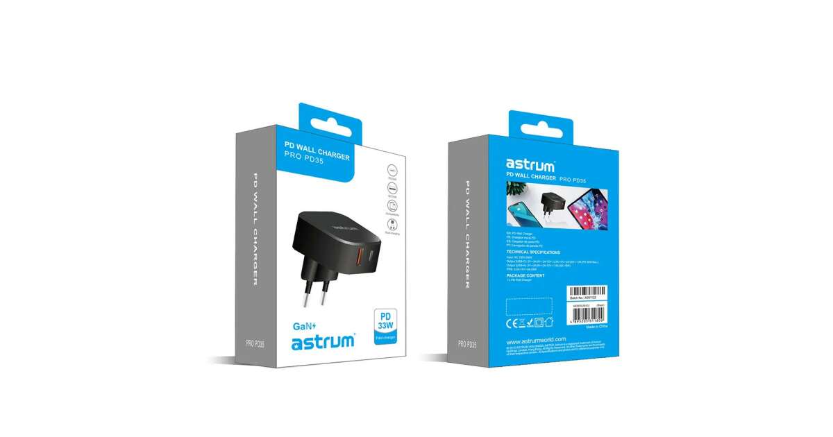 Astrum PRO PD35 Netzwerk-Schnellladegerät mit 1X USB (18W), 1X Typ-C (30W) Anschluss schwarz Beschreibung