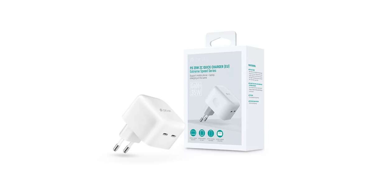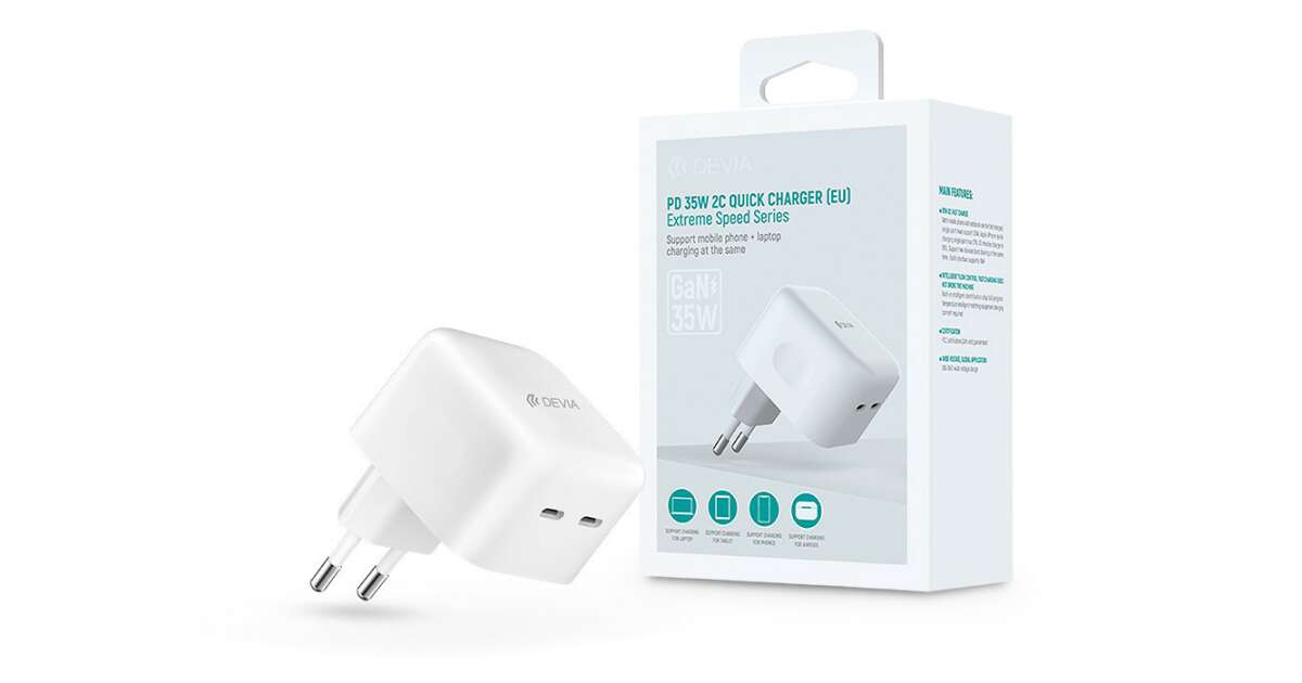 Devia GaN-Netzwerkladeadapter mit 2xTyp-C-Eingang – 35 W – Devia Extreme SpeedSeries PD 35 W 2C-Schnellladegerät – Weiß Kaufen: