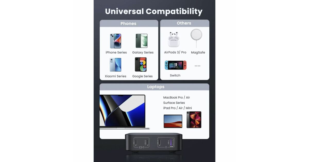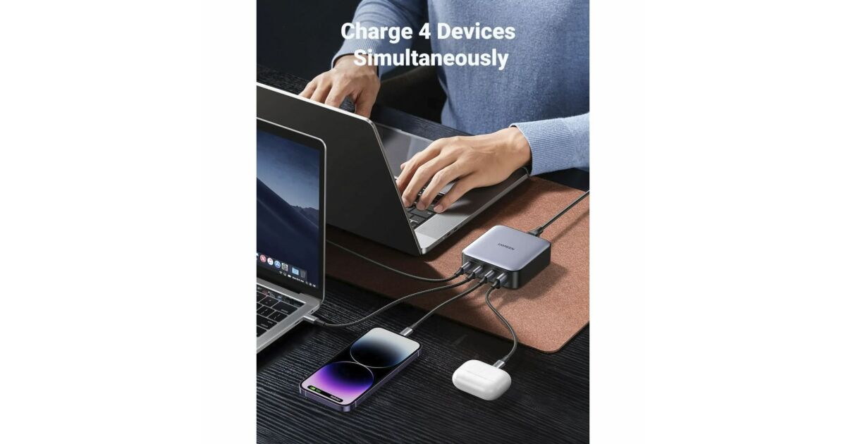 - 4 Anschlüsse (3 USB-C + 1 USB-A): Mehrere Geräte gleichzeitig laden.