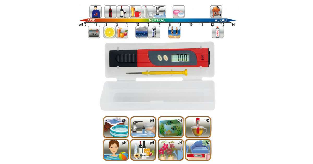 Dieses digitale pH-Messgerät und Thermometer misst gleichzeitig den pH-Wert (0,00-14,00) und die Temperatur (0-60°C) von Flüssigkeiten. Es ist ideal für den Heimgebrauch, aber auch nützlich in Hobby- und Profibereichen.