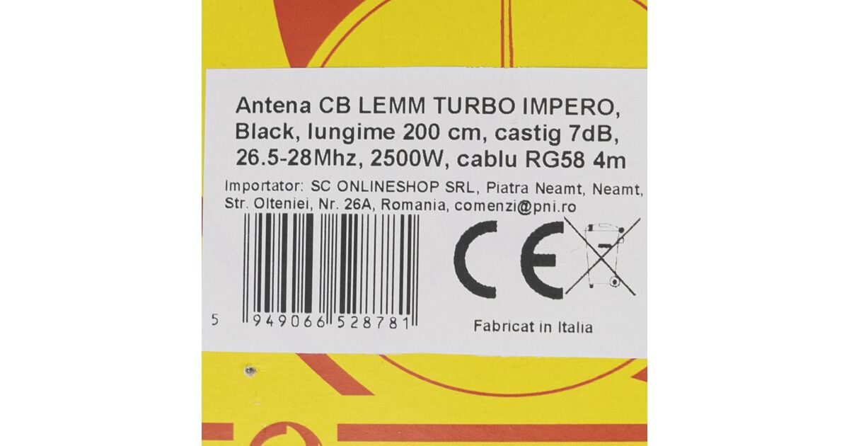 LEMM CB-Antenne TURBO IMPERO, Schwarz, Länge 200 cm, Verstärkung 7 dB, 26,5-28 MHz, 2500 W, RG58-Kabel 4 m, hergestellt in Italien Beschreibung