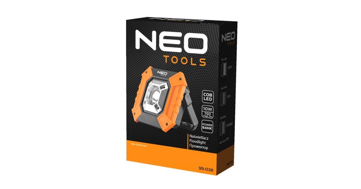 Neo Tools 99-038 Flutlicht, Sockel, Batterie 3xaa ,cob led 750lum, Powerbank-Funktion, 10w, Orange/Schwarz Beschreibung