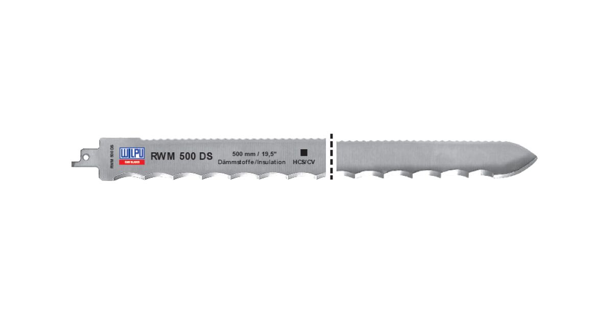 Das RWM 500 DS Säbelsägeblatt ist die ideale Wahl zum Schneiden von Mineralwolle, Schäumen (EPS/PUR), Polystyrol, Leder, Gummi und Karton bis zu einer Dicke von 450 mm.