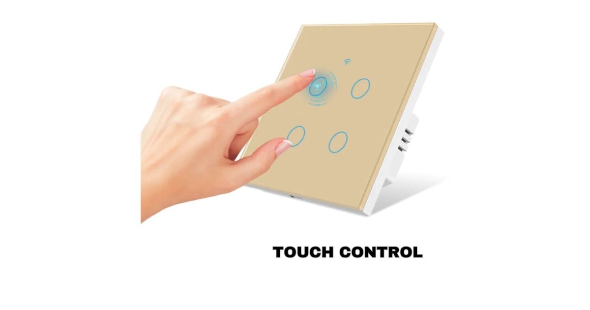 Dieser 4-fach intelligente Touch-Schalter revolutioniert deine Wohnraumbeleuchtung! Genieße Komfort und die Vorteile moderner Technologie mit diesem eleganten, goldfarbenen Gerät.