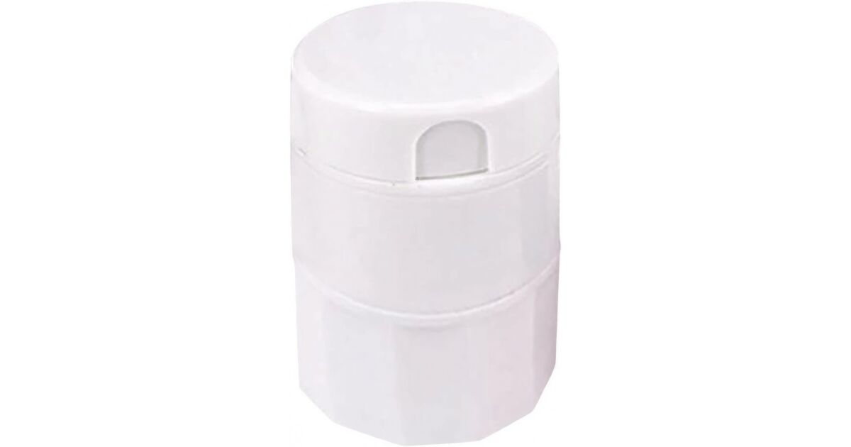 Multifunktionale Pillendose, Flippy, 4 in 1, Wasserbecher, Schneiden, Zerkleinern, Aufbewahren, kompakt, ABS mit Edelstahlklinge, weiß, 8,7 x 6,2 x 4,1 cm Beschreibung