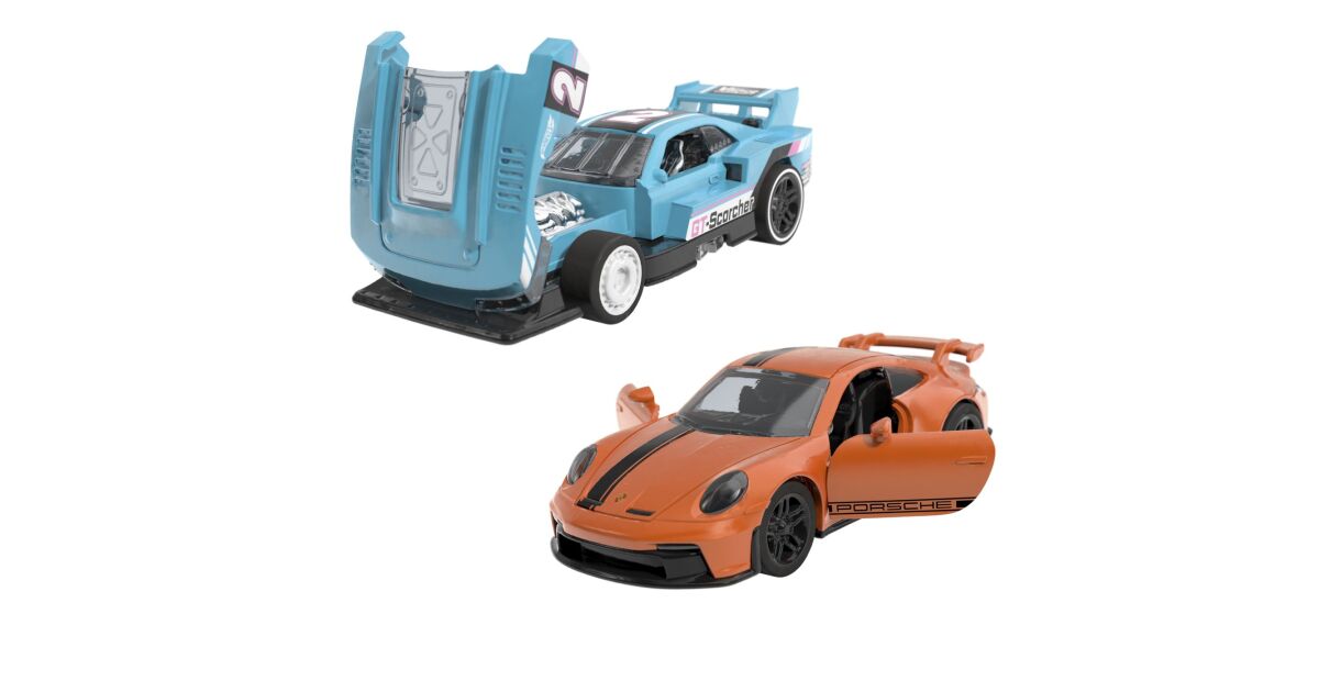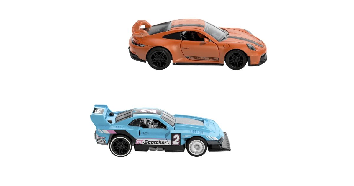 Aufregende Rennen mit dem Hot Wheels 2er-Pack! Zwei klassische Modelle, der GT-Scorcher und der Porsche 911 GT3, jetzt im Maßstab 1:43 mit Rückziehmechanismus.