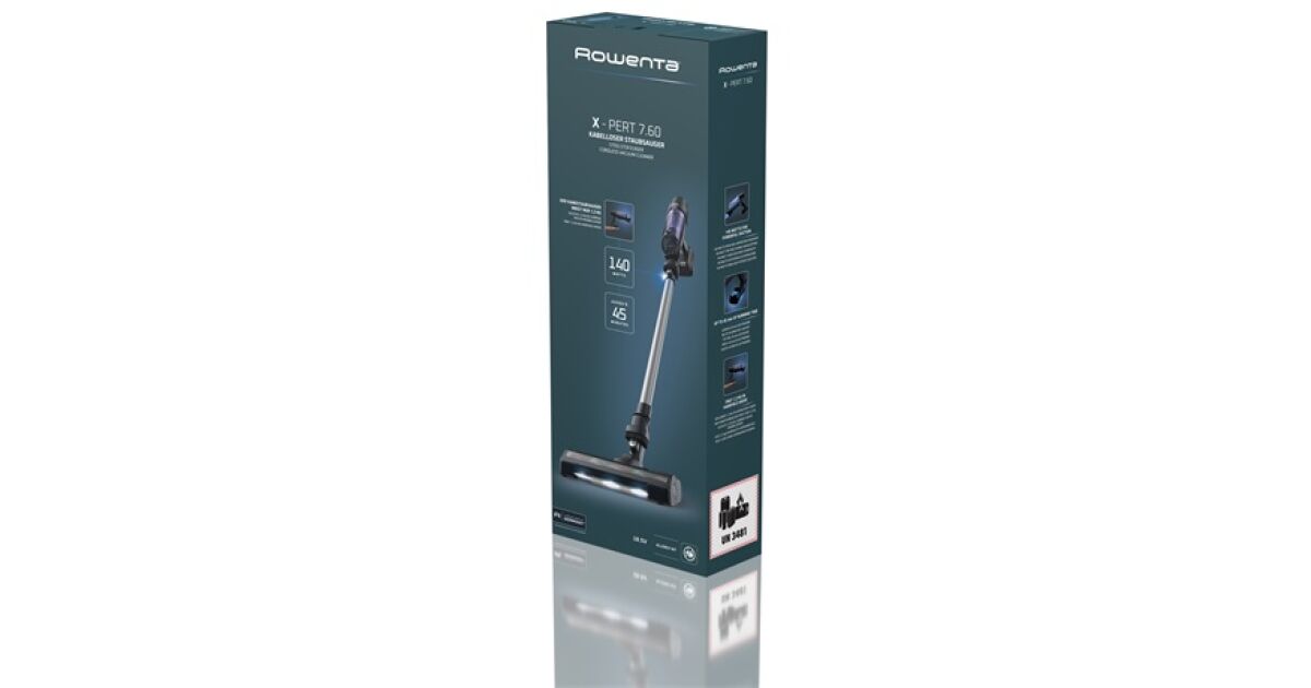 Rowenta X-Pert 7.60 RH6A35. Reinigungsart: Trocken, Schmutztrennungsmethode: Zyklonal, Luftstrom: 59,22 l/min. Staubbehälter Typ: Beutellos, Produktfarbe: Violett, Silber, Schmutzaufnahmekapazität (Trockenanwendung): 0,44 l. Energiequelle: Akku, Laufzeit: 45 min, Ladezeit: 3 h. Gewicht: 2 kg, Breite: 240 mm, Tiefe: 248 mm. Staubsaugerbürsten enthalten: Bürste mit LED-Leuchten
