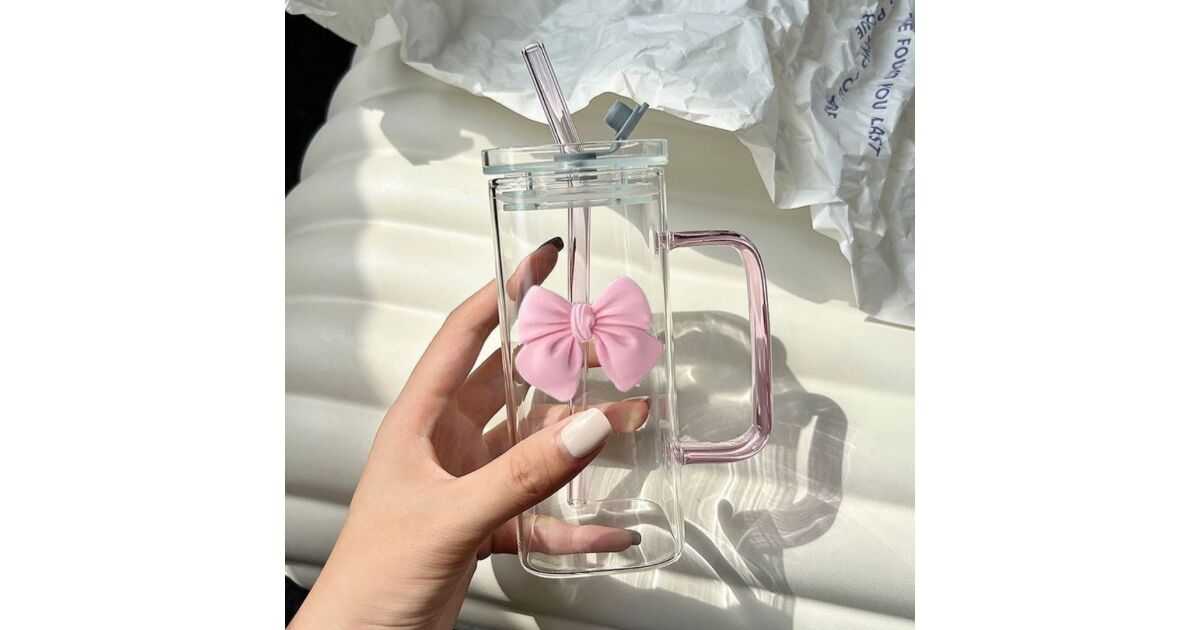 eCarla Rechteckiger Borosilikatglasbecher mit rosa Schleife: Stilvolles und praktisches Trinken 🎀